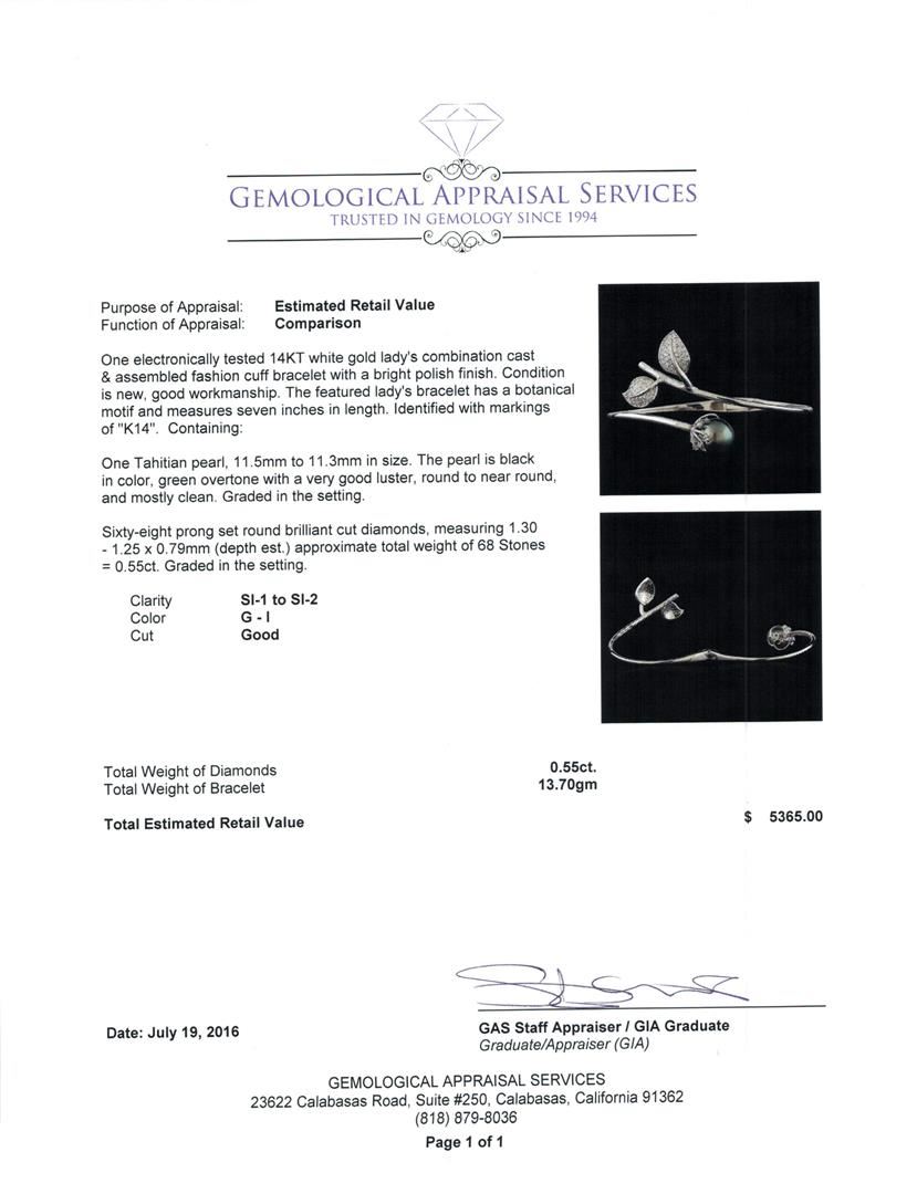 One electronically tested 14KT white gold lady's combination cast & assembled fashion cuff bracelet with a bright polish finish. The featured lady's bracelet has a botanical motif and measures seven inches in length. Identified with markings of 'K14'. Condition is new, good workmanship. Containing: One Tahitian pearl, 11.5mm to 11.3mm in size. The pearl is black in color, green overtone with a very good luster, round to near round, and mostly clean. Graded in the setting. Sixty-Eight prong set round brilliant cut diamonds, measuring 1.30 - 1.25 x 0.79mm (depth est.) approximate total weight of 68 Stones = 0.55ct. Graded in the setting. Clarity SI-1 to SI-2. Color: G - I Cut Good. Total Weight of Diamonds 0.55ct.. Total Weight of Bracelet 13.70gm. GAS Appraised at $5,365.00.