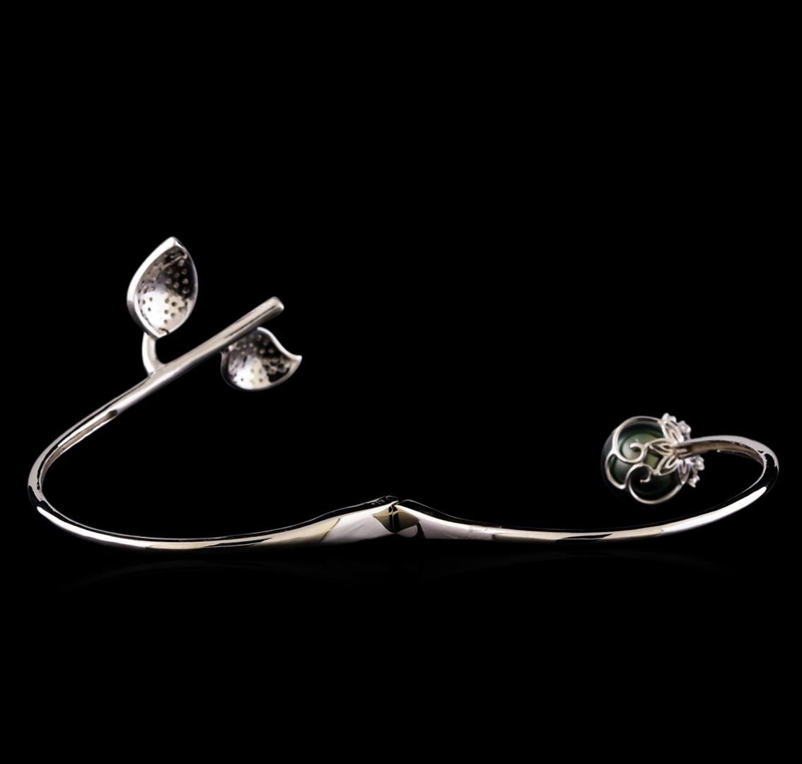 One electronically tested 14KT white gold lady's combination cast & assembled fashion cuff bracelet with a bright polish finish. The featured lady's bracelet has a botanical motif and measures seven inches in length. Identified with markings of 'K14'. Condition is new, good workmanship. Containing: One Tahitian pearl, 11.5mm to 11.3mm in size. The pearl is black in color, green overtone with a very good luster, round to near round, and mostly clean. Graded in the setting. Sixty-Eight prong set round brilliant cut diamonds, measuring 1.30 - 1.25 x 0.79mm (depth est.) approximate total weight of 68 Stones = 0.55ct. Graded in the setting. Clarity SI-1 to SI-2. Color: G - I Cut Good. Total Weight of Diamonds 0.55ct.. Total Weight of Bracelet 13.70gm. GAS Appraised at $5,365.00.