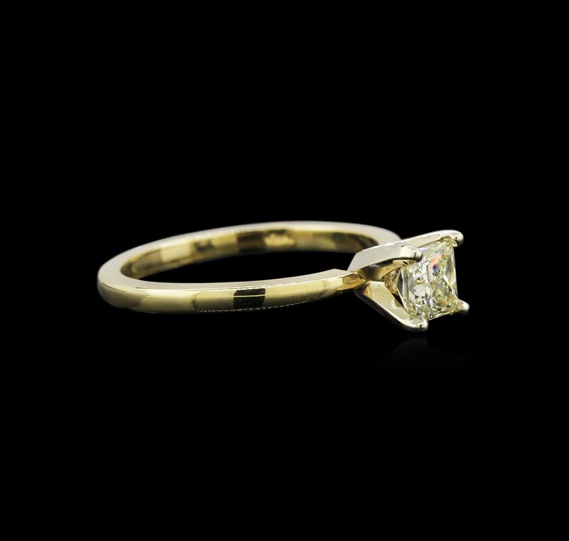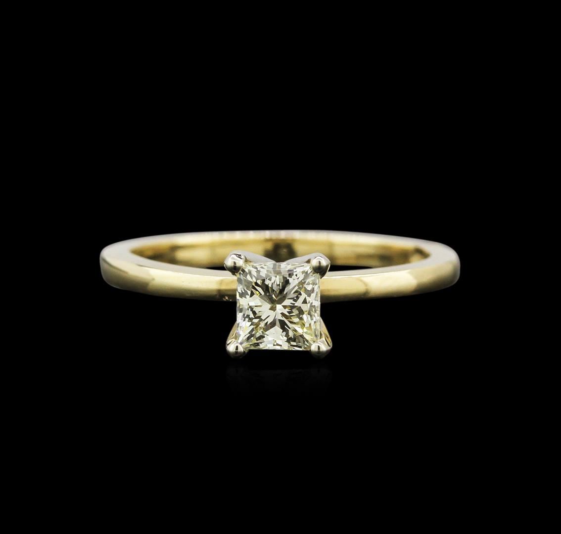 One electronically tested 18KT yellow gold ladies cast & assembled diamond solitaire ring with a bright polish finish. Condition is new, good workmanship. Bright polish finish. Ring size 5.50. Identified with markings of "18K". Containing: One prong set princess cut diamond, measuring 4.40 x 4.30 x 3.30mm (depth est.) approximate weight of 0.55ct with a strong blue fluorescence. Graded in the setting. Clarity: SI-1. Color: Very Light Yellow. Depth: 76.7%. Table: 74.4%. Total Weight of Diamonds: 0.55ct. Total Weight of Ring: 2.25 gm. AIG Appraised at $2,135.00.