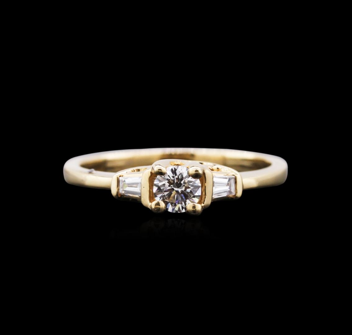 One ring featuring: 14KT yellow gold weighing 2.10 grams containing one diamond center stone with a total weight of 0.20ct and two tapered baguette cut diamonds with a total weight of 0.35ct.