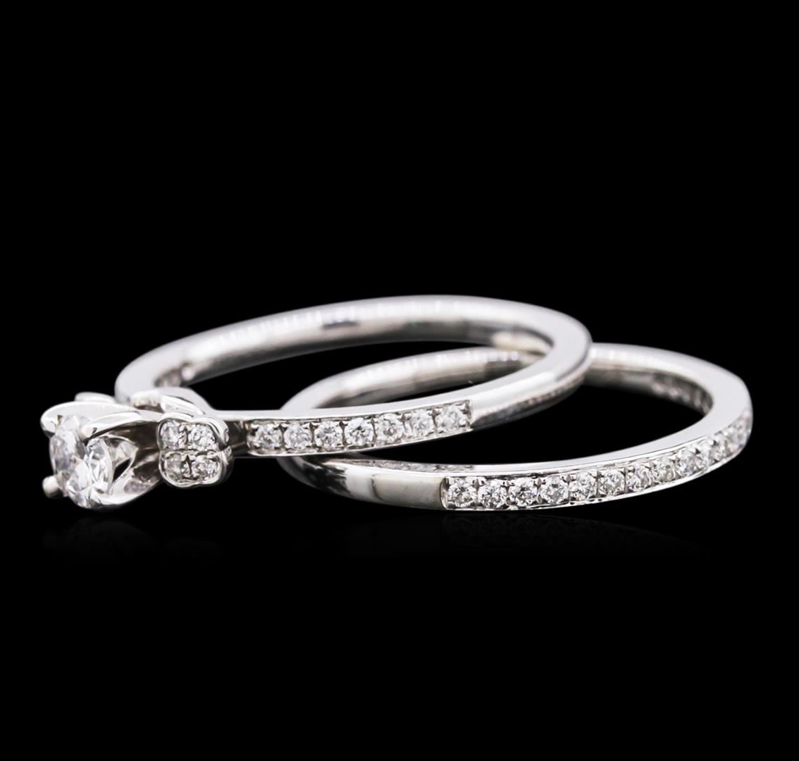 One wedding ring set featuring: 14KT white gold weighing 2.80 grams containing one diamond center stone with a total weight of 0.24ct and 43 brilliant cut diamonds with a total weight of 0.31ct.