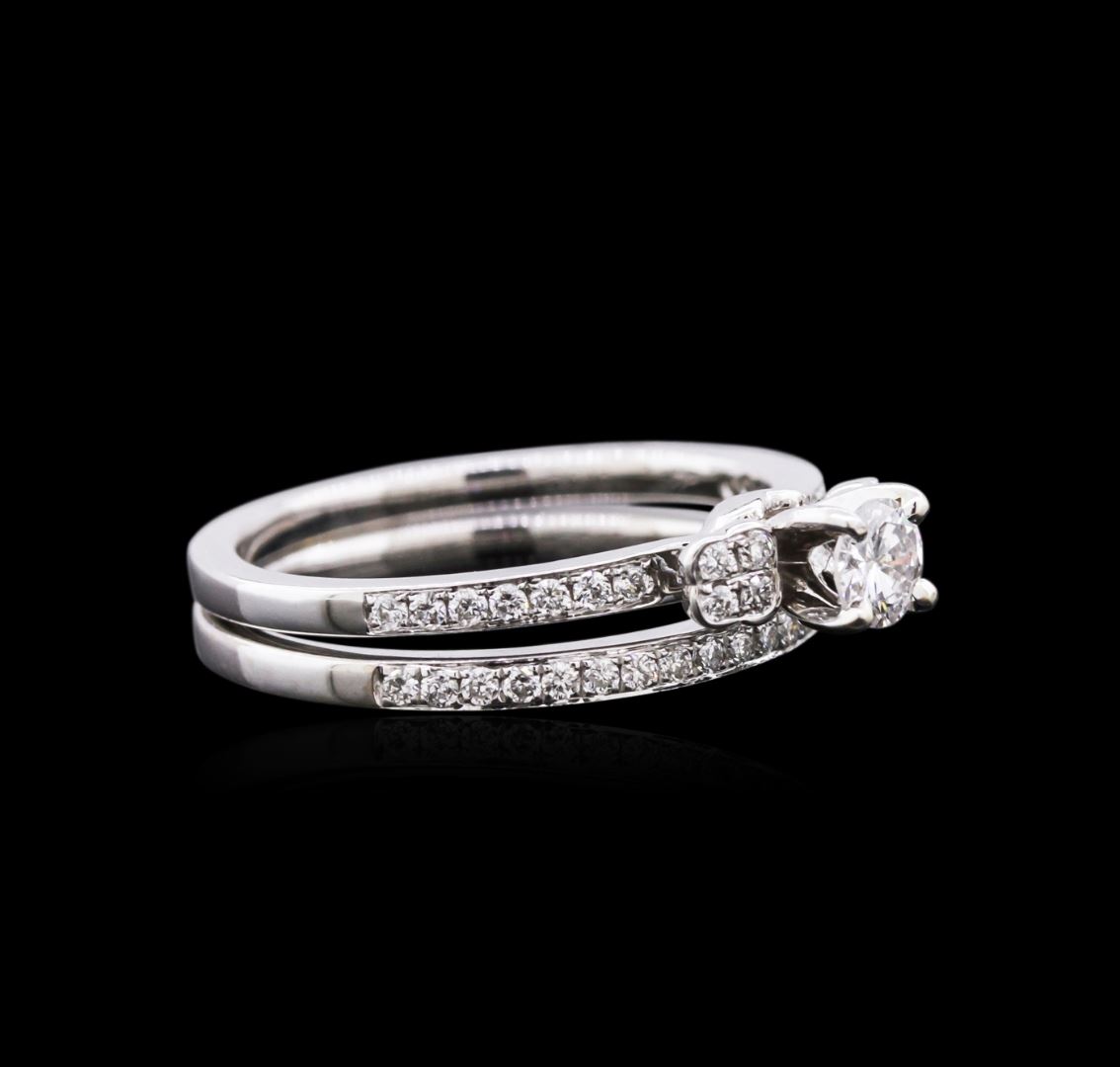 One wedding ring set featuring: 14KT white gold weighing 2.80 grams containing one diamond center stone with a total weight of 0.24ct and 43 brilliant cut diamonds with a total weight of 0.31ct.