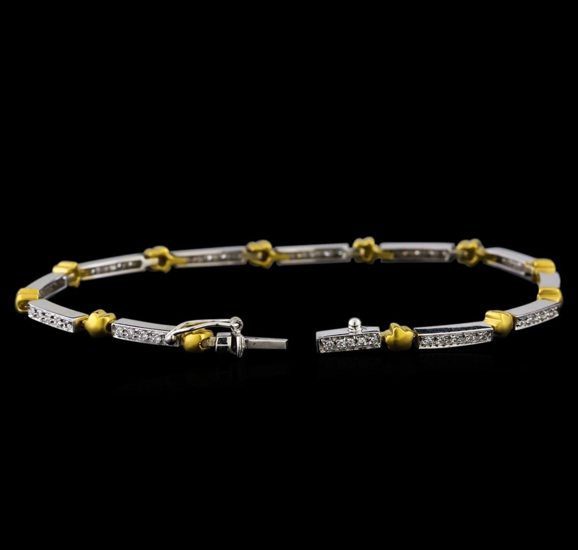 One electronically tested 18KT white and yellow gold lady's combination cast & assembled fashion bracelet with a tongue clasp & foldover safety with a bright polish and satin finish. The featured lady's bracelet measures 7 inches in length. Identified with markings of "750". Condition is like new, good workmanship. Containing: Sixty bead set round brilliant cut diamonds, measuring 1.40 - 1.30 x 0.84mm (depth est.) approximate total weight of 60 Stones = 0.56ct. Graded in the setting. Clarity: VS-2 to SI-1. Color: G - Good. Total Weight of Diamonds 0.56ct. Total Weight of Bracelet 12.70gm. GAS Appraised at $4,735.00.