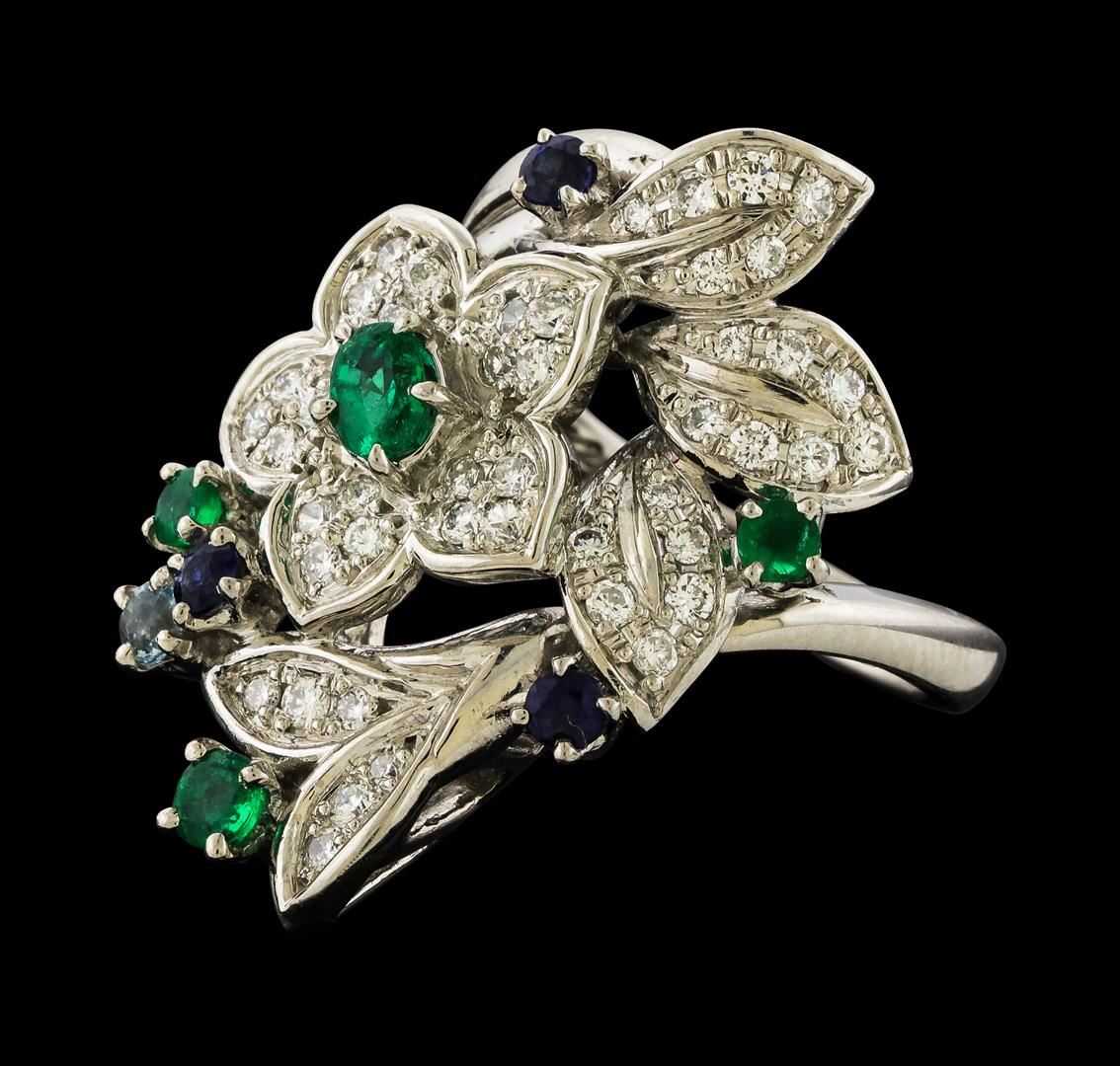One ring featuring: Platinum containing Diamonds with a total weight of 0.56ct, Emerald with a total weight of 0.52ct, and Sapphire with a total weight of 0.25ct. Total Weight of Ring: 14.4 grams.