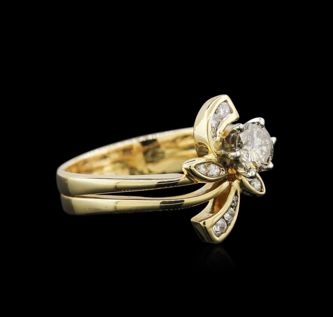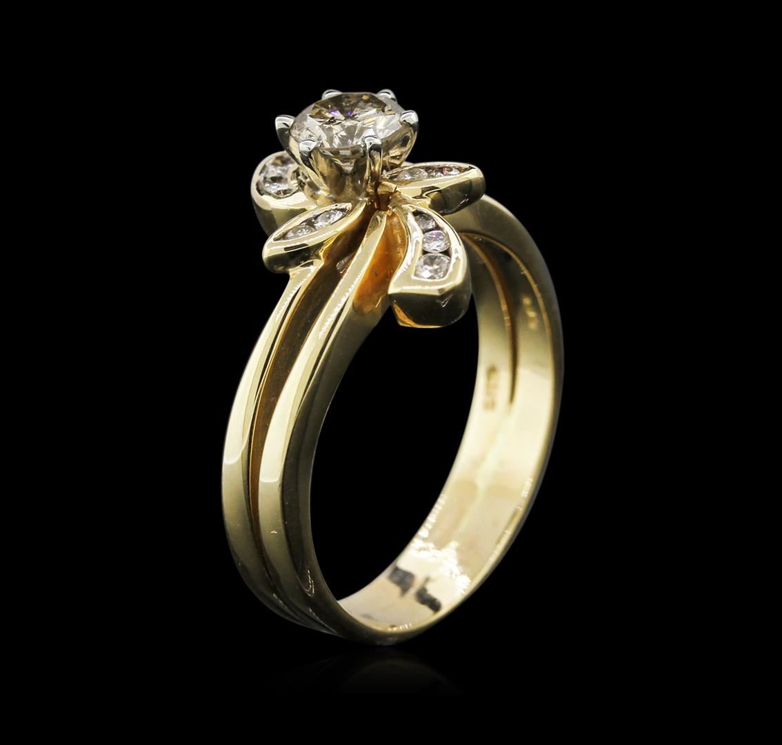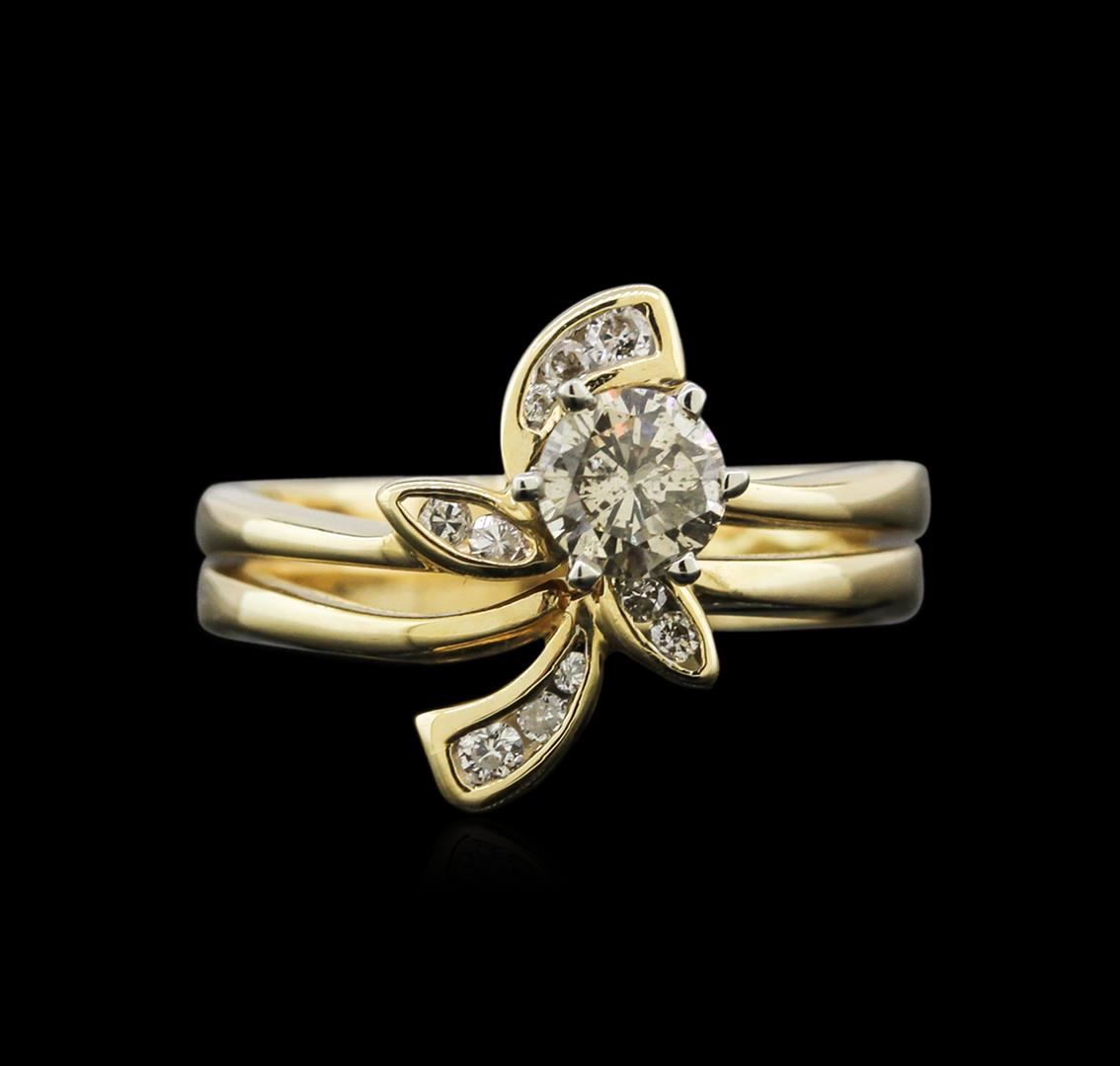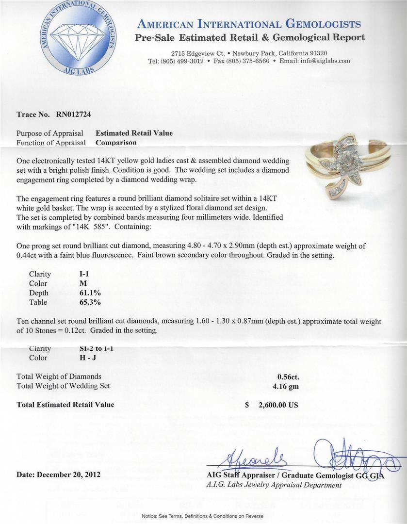 One electronically tested yellow gold ladies cast & assembled diamond wedding set with a bright polish finish. Condition is good. The wedding set includes a diamond engagement ring completed by a diamond wedding wrap. The engagement ring features a round brilliant diamond solitaire set within a white gold basket. The wrap is accented by a stylized floral diamond set design. The set is completed by combined bands measuring four millimeters wide. Identified with markings of'T4K 585". Containing: One prong set round brilliant cut diamond, measuring 4.80 - 4.70 x 2.90mm (depth est.) approximate weight of0.44ct with a faint blue fluorescence. Faint brown secondary color throughout. Graded in the setting. Clarity: I-1Color: : 61.1%.Table: 65.3%.Ten channel set round brilliant cut diamonds, measuring 1.60 - 1.30 x 0.87mm (depth est.) approximate total weight of 10 Stones = 0.12ct. Graded in the setting. Clarity: SI-2 to 1-1.Color: H - J. AIG Appraised at $2,600.00.