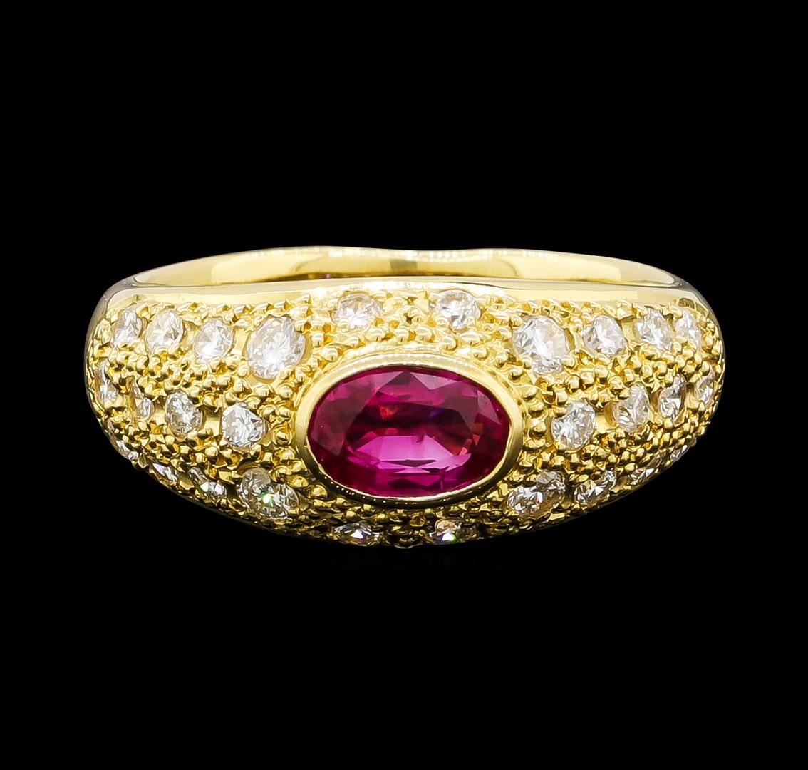 One ring featuring: 18KT Yellow Gold containing Ruby with a total weight of 0.56ct and Diamonds. Total Weight of Ring: 5.4 grams.