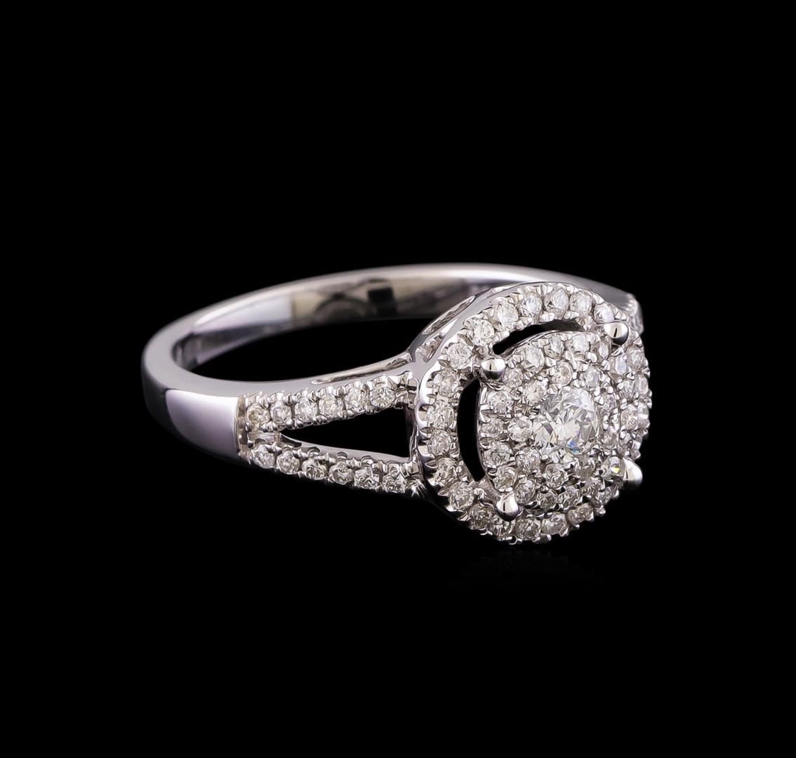 One electronically tested 14KT white gold lady's cast wedding ring with a split shank cathedral basket halo with a bright polish finish. The featured lady's ring has a shank measuring 2.06 millimeters in width. Identified with markings of '14K'. Condition is new, good workmanship. Containing: One prong set round brilliant cut diamond, measuring 3.40 - 3.35 x 2.10mm (depth est.) approximate weight of 0.15ct. Graded in the setting. Clarity SI-2. Color: G Cut Good Seventy-Six prong set round brilliant cut diamonds, measuring 1.20 - 1.10 x 0.69mm (depth est.) approximate total weight of 76 Stones = 0.42ct. Graded in the setting. Clarity SI-1 to SI-2. Color: G - H Cut Good. Total Weight of Diamonds 0.57ct.. Total Weight of Ring 3.50gm. GAS Appraised at $2,845.00.