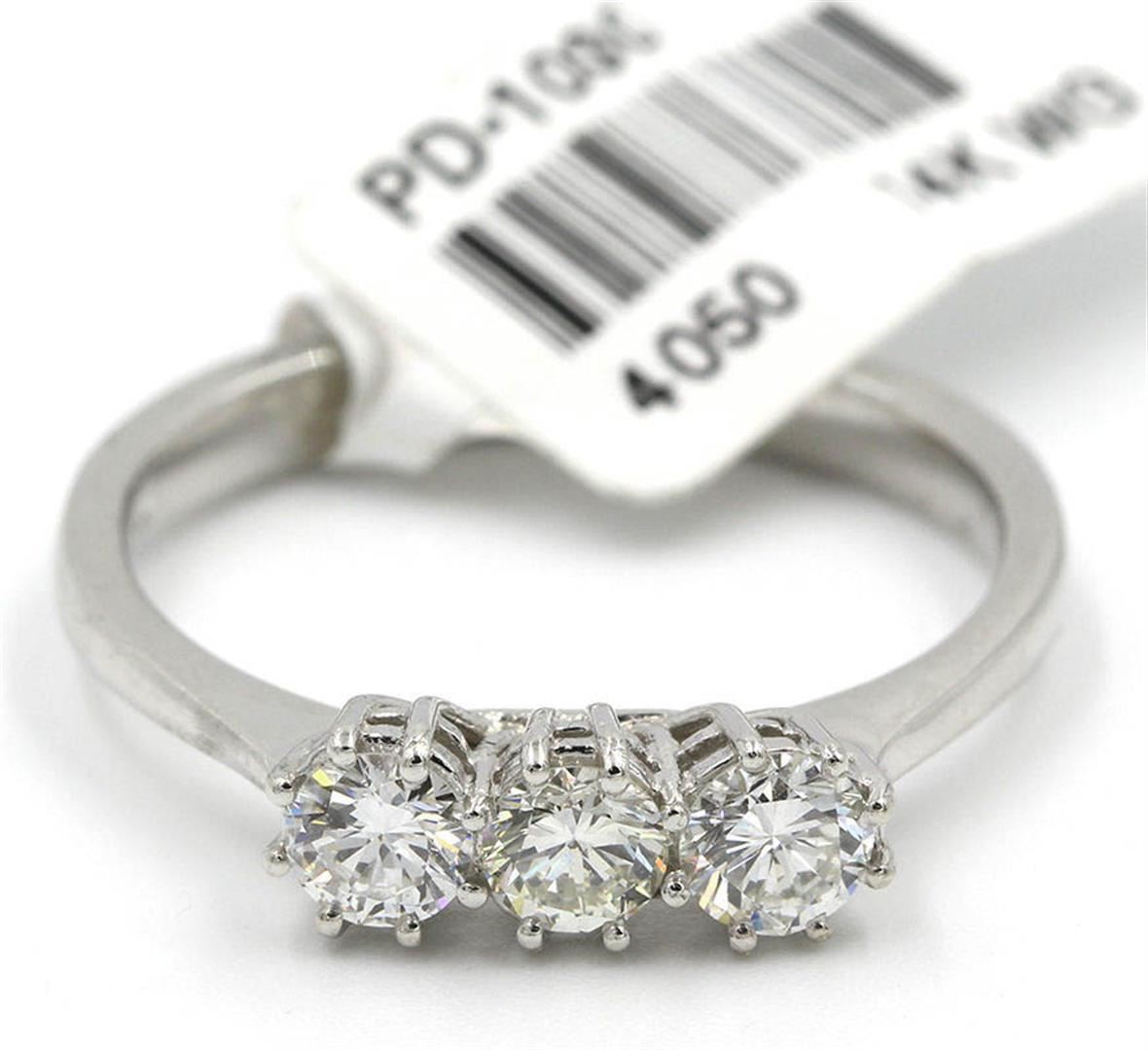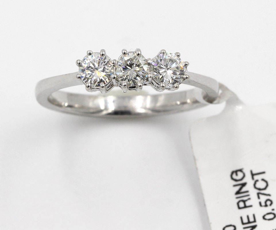 One lady's three stone ring featuring: 14KT white gold weighing 1.41 grams containing three diamonds weighing 0.57ctw. The diamonds are round brilliant cut with VS1 clarity, G-H color and very good cut. The ring is a size 6.75 but can be resized.