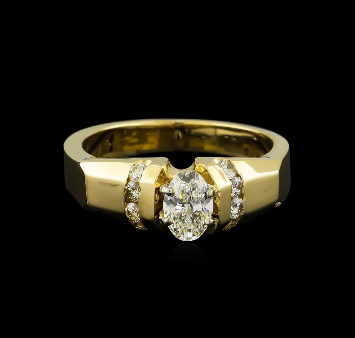 One electronically tested 14KT yellow gold lady's cast wedding ring with a bright polish finish. The featured lady's ring has a shank measuring 3.12 millimeters wide. Identified with markings of "14K". Condition is new, good workmanship. Containing: One prong set oval shaped cut diamond, measuring 6.27 x 4.34 x 2.73mm (depth est.) approximate weight of 0.49ct. Graded in the setting. Clarity: SI-1. Color: L - M. Cut Good Eight channel set round brilliant cut diamonds, measuring 1.90 - 1.80 x 1.11mm (depth est.) approximate total weight of 8 Stones = 0.18ct. Graded in the setting. Clarity: VS-2 to SI-1. Color: H - Very Good. Total Weight of Diamonds 0.67ct. Total Weight of Ring 6.70gm GAS Appraised at $3,400.00.