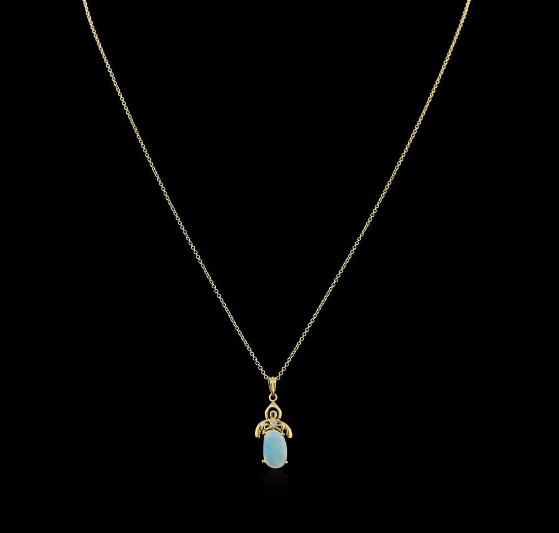 One pendant with chain featuring: 14KT yellow gold weighing 0.94 grams containing one prong set oval cut opal center stone with a total weight of 0.57ct and one prong set round diamond with a total weight of 0.02ct.