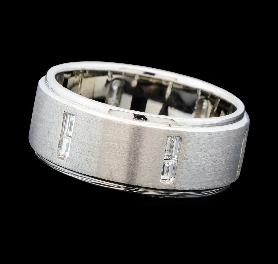 One electronically tested 14KT white gold man's cast wedding band with a bright polish and satin finish. The featured man's band has a shank measuring 9.40 millimeters wide. Identified with markings of '14K'. Condition is new, good workmanship. Containing: Twelve channel set baguette cut diamonds, measuring from 2.70 x 1.50 x 1.28mm (depth est.) to 2.80 x 1.60 x 1.36mm (depth est.) approximate total weight of 12 Stones = 0.58ct. Graded in the setting. Clarity VS-2 to SI-1. Color: G - H Cut Very Good. Total Weight of Diamonds 0.58ct.. Total Weight of Band 13.70gm GAS Appraised at $3,770.00.