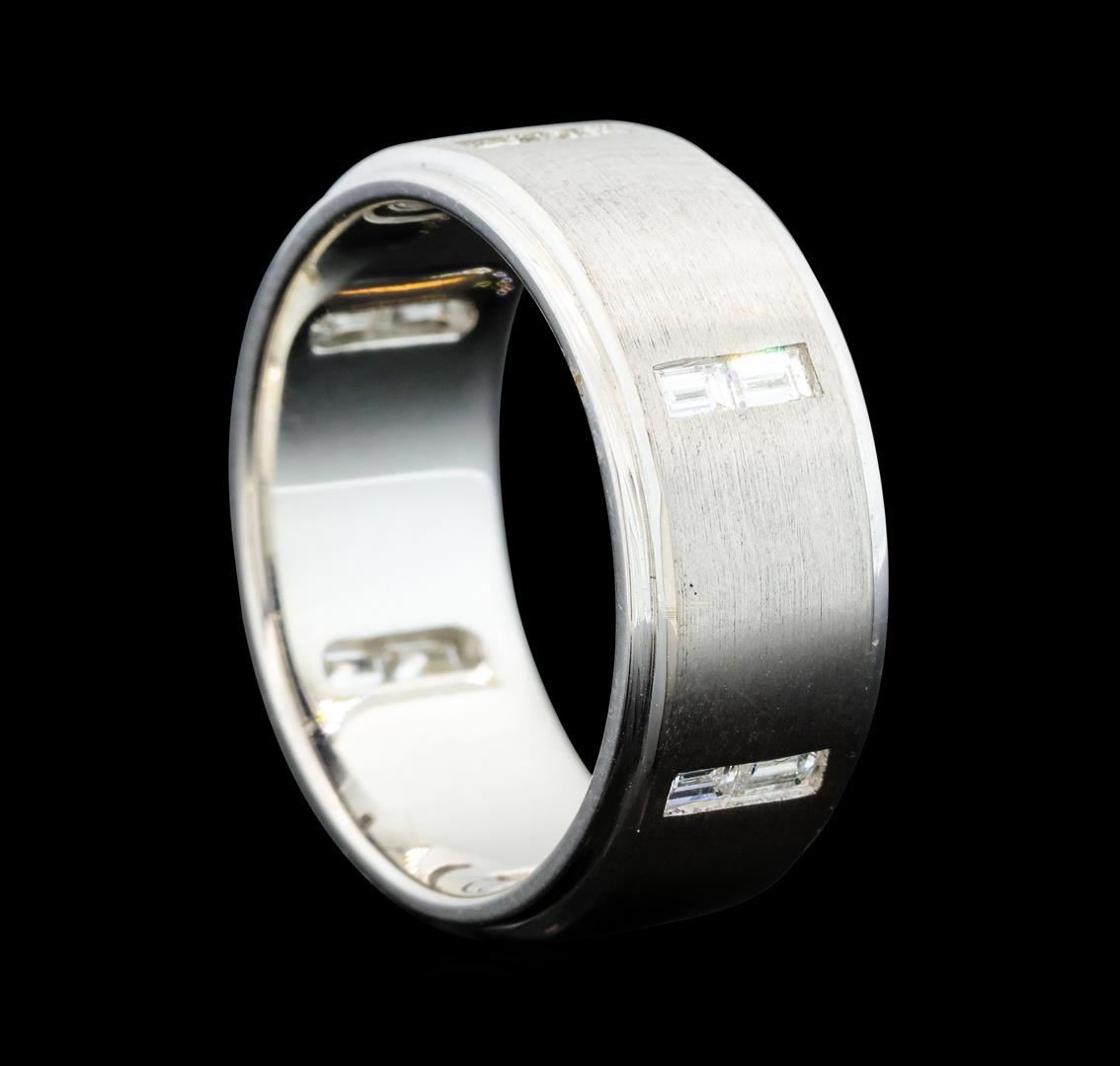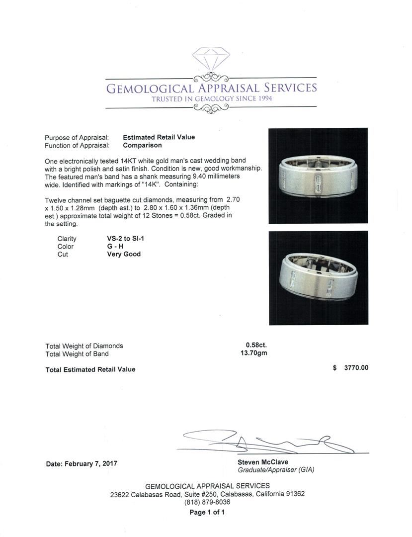 One electronically tested 14KT white gold man's cast wedding band with a bright polish and satin finish. The featured man's band has a shank measuring 9.40 millimeters wide. Identified with markings of '14K'. Condition is new, good workmanship. Containing: Twelve channel set baguette cut diamonds, measuring from 2.70 x 1.50 x 1.28mm (depth est.) to 2.80 x 1.60 x 1.36mm (depth est.) approximate total weight of 12 Stones = 0.58ct. Graded in the setting. Clarity VS-2 to SI-1. Color: G - H Cut Very Good. Total Weight of Diamonds 0.58ct.. Total Weight of Band 13.70gm GAS Appraised at $3,770.00.