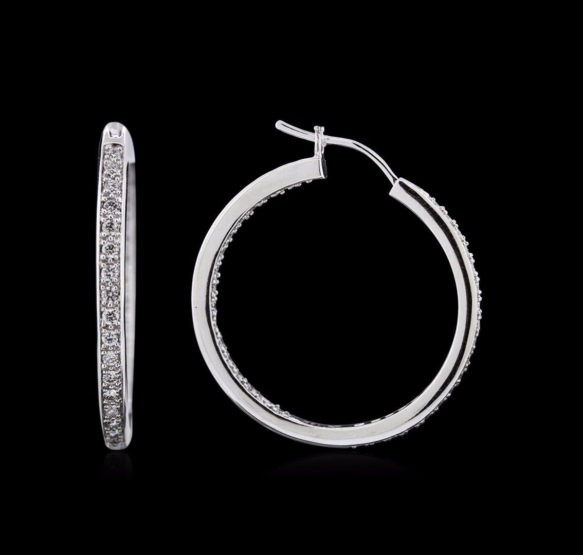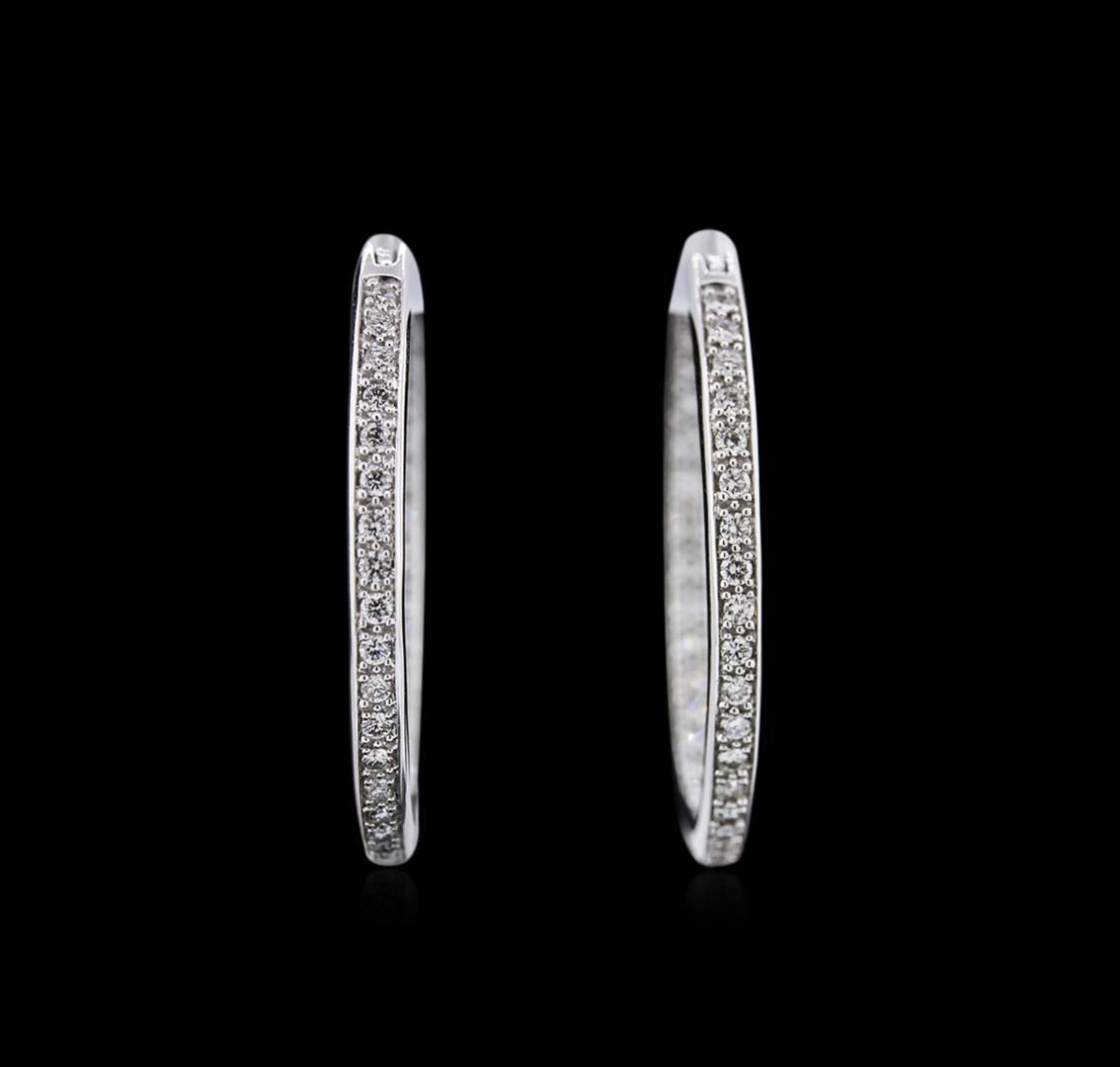 One pair electronically tested 18KT white gold ladies cast diamond hoop earrings with hinged clip backs with a bright polish finish. Identified with markings of "18K". Condition is new. Containing: Seventy-Two prong set round brilliant cut diamonds, measuring 1.30 - 1.30 x 0.78mm (depth est.) approximate total weight of 72 Stones = 0.58ct. Clarity: SI-1 to SI-2. Color: H - I, Cut is Good. Diamonds are graded in the mounting, unless otherwise stated. Total Weight of Diamonds 0.58ct. Total Weight of Hoop Earrings 12.40gm. GGL Appraised at $3,840.00.