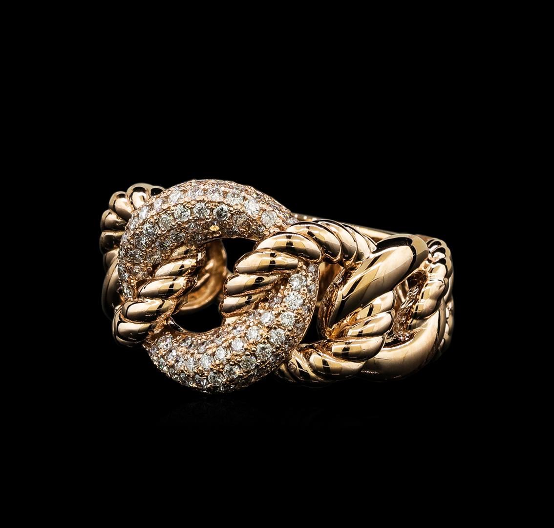 One electronically tested 14KT rose gold lady's cast fashion ring with a bright polish finish. The featured lady's ring has nine conjoined, graduated links and a shank measuring 6.63 millimeters wide. Identified with markings of 'K14'. Condition is new, good workmanship. Containing: Ninety prong set round brilliant cut diamonds, measuring 1.20 - 1.15 x 0.73mm (depth est.) approximate total weight of 90 Stones = 0.58ct. Graded in the setting. Clarity SI-1 to I-1. Color: G - I Cut Good. Total Weight of Diamonds 0.58ct.. Total Weight of Ring 9.80gm GAS Appraised at $3,750.00.
