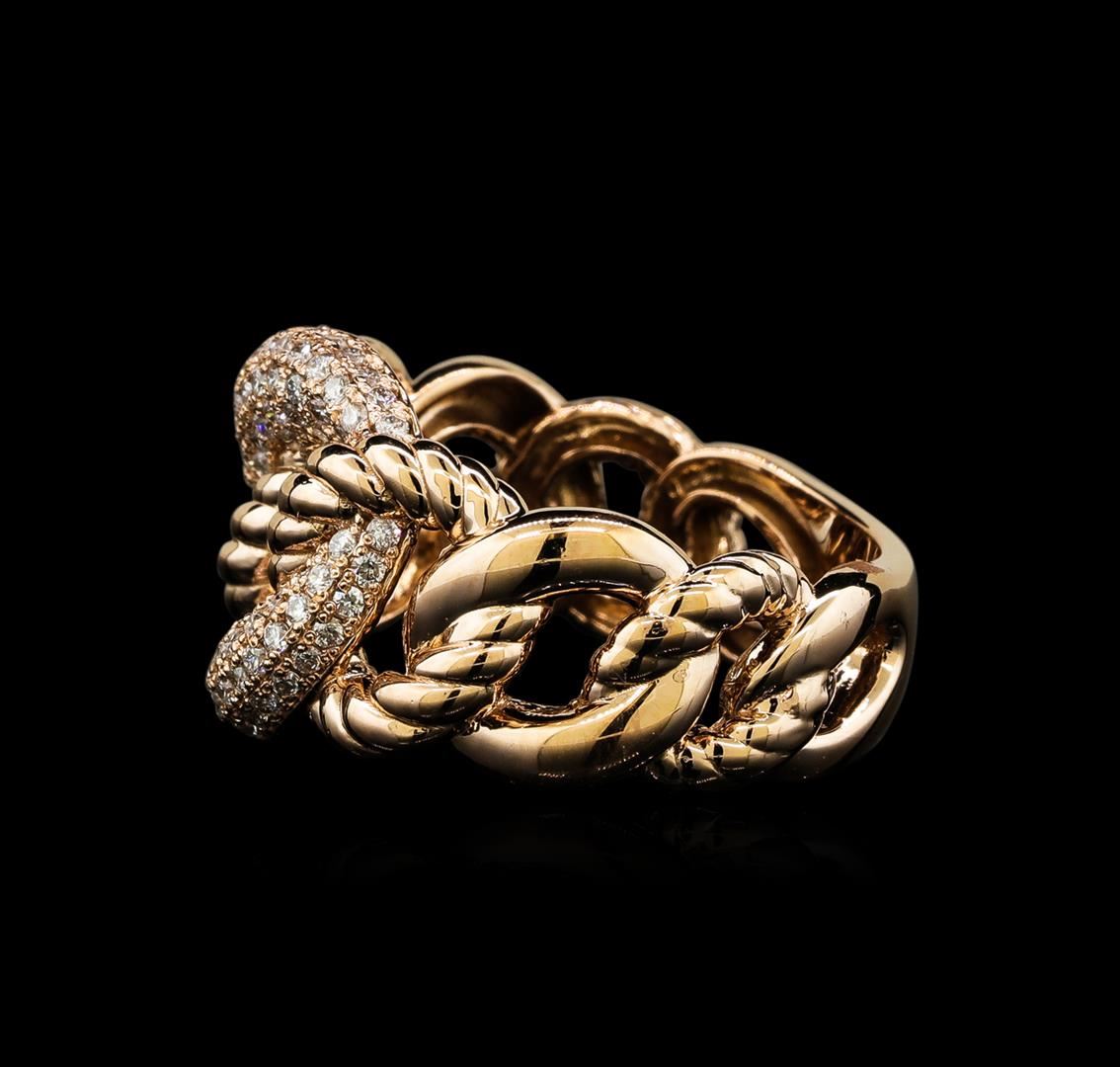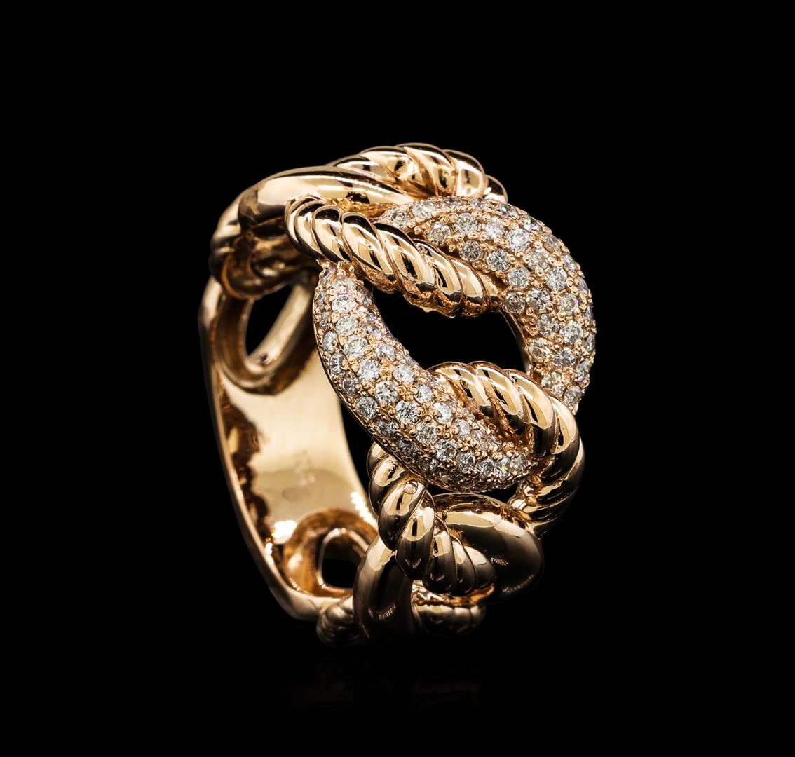 One electronically tested 14KT rose gold lady's cast fashion ring with a bright polish finish. The featured lady's ring has nine conjoined, graduated links and a shank measuring 6.63 millimeters wide. Identified with markings of 'K14'. Condition is new, good workmanship. Containing: Ninety prong set round brilliant cut diamonds, measuring 1.20 - 1.15 x 0.73mm (depth est.) approximate total weight of 90 Stones = 0.58ct. Graded in the setting. Clarity SI-1 to I-1. Color: G - I Cut Good. Total Weight of Diamonds 0.58ct.. Total Weight of Ring 9.80gm GAS Appraised at $3,750.00.