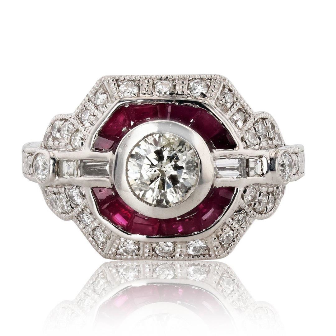 DESCRIPTION: ONE PLATINUM LADY'S CUSTOM MADE DIAMOND & RUBY RING. 9.90 GR TW. 1 â€" MAIN CENTER GEMSTONE(S): IDENTITY : ONE CENTER NATURAL DIAMOND SET IN BEZEL SETTING STYLE. CARAT WEIGHT : 0.52CT. SHAPE & MEASUREMEMT : ROUND BRILLIANT CUT. APPROX : 5.96 MM. QUALITY : I1 CLARITY, H/I COLOR. *ADDITIONAL 12 COUNTS BAGUETTE CUT RUBIES TW: 1.06 CTS. 2 â€" ADJACENT GEMSTONES: IDENTITY : NATURAL DIAMONDS. SHAPE : ROUND BRILLIANT & BAGUETTE CUT. CARAT WEIGHT : 0.58CT TW. QUALITY : H COLOR , SI CLARITY. ALL FINE CUTTING AND PROPORTIONS. ALL PRONGS & CHANNEL SETTINGS STYLE. TOTAL GEMSTONES WEIGHT : 2.16CT TW.