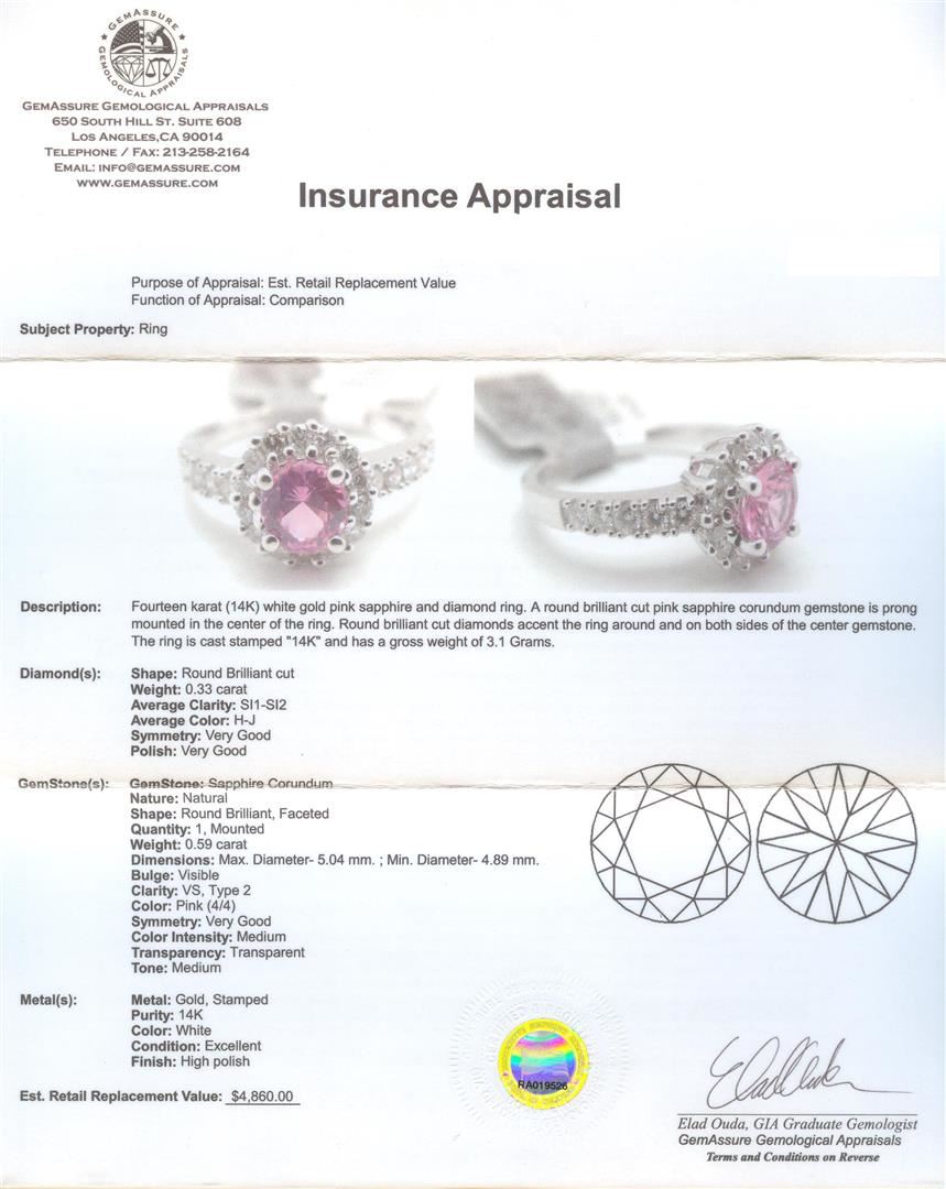 Fourteen karat (14K) white gold pink sapphire and diamond ring. A round brilliant cut pink sapphire corundum gemstone is prong mounted in the center of the ring. Round brilliant cut diamonds accent the ring on both sides of the center gemstone. The ring is cast stamped "14K" and has a gross weight of 3.1 Grams. Diamond(s): Shape: Round Brilliant cut. Weight: 0.33 carat. Average Clarity: SI1-SI2. Average Color: H-J. Symmetry: Very Good. Polish: Very Good. GemStone(s): GemStone: Sapphire Corundum. Nature: Natural. Shape: Round Brilliant, Faceted. Quantity: 1, Mounted. Weight: 0.59 carat. Dimensions: Length- 5.04 mm ; Min Diameter- 4.89 mm. Bulge: Visible: Clarity: VS, Type 2. Color: Pink (4/4). Symmetry: Very Good. Color Intensity: Medium. Transparency: Transparent. Tone: Medium. Metal(s): Metal: Gold, Stamped. Purity: 14K. Color: White. Condition: Excellent. Finish: High polish. GGA Appraised at $4,860.00.