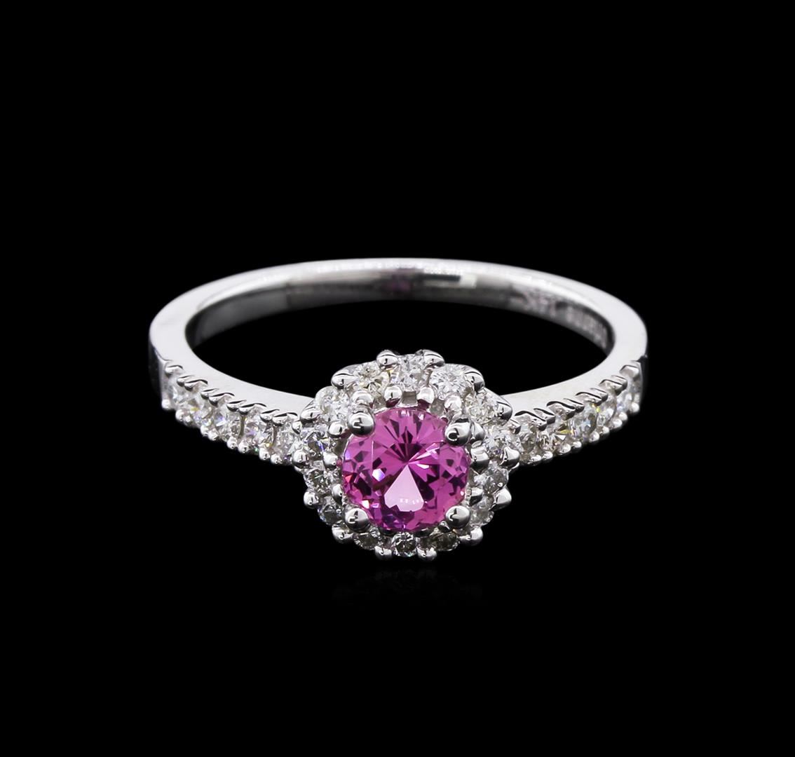 Fourteen karat (14K) white gold pink sapphire and diamond ring. A round brilliant cut pink sapphire corundum gemstone is prong mounted in the center of the ring. Round brilliant cut diamonds accent the ring on both sides of the center gemstone. The ring is cast stamped "14K" and has a gross weight of 3.1 Grams. Diamond(s): Shape: Round Brilliant cut. Weight: 0.33 carat. Average Clarity: SI1-SI2. Average Color: H-J. Symmetry: Very Good. Polish: Very Good. GemStone(s): GemStone: Sapphire Corundum. Nature: Natural. Shape: Round Brilliant, Faceted. Quantity: 1, Mounted. Weight: 0.59 carat. Dimensions: Length- 5.04 mm ; Min Diameter- 4.89 mm. Bulge: Visible: Clarity: VS, Type 2. Color: Pink (4/4). Symmetry: Very Good. Color Intensity: Medium. Transparency: Transparent. Tone: Medium. Metal(s): Metal: Gold, Stamped. Purity: 14K. Color: White. Condition: Excellent. Finish: High polish. GGA Appraised at $4,860.00.