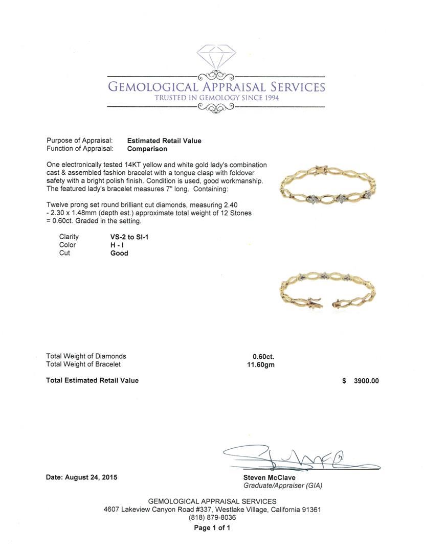 One electronically tested 14KT yellow and white gold lady's combination cast & assembled fashion bracelet with a tongue clasp with foldover safety with a bright polish finish. The featured lady's bracelet measures 7" long. Condition is used, good workmanship. Containing: Twelve prong set round brilliant cut diamonds, measuring 2.40 - 2.30 x 1.48mm (depth est.) approximate. Total Weight of 12 Stones = 0.60ct. Graded in the setting. Clarity: VS-2 to SI-1. Color: H - I. Cut Good. Total Weight of Diamonds 0.60ct. Total Weight of Bracelet 11.60gm. GAS Appraised at $3,900.00.