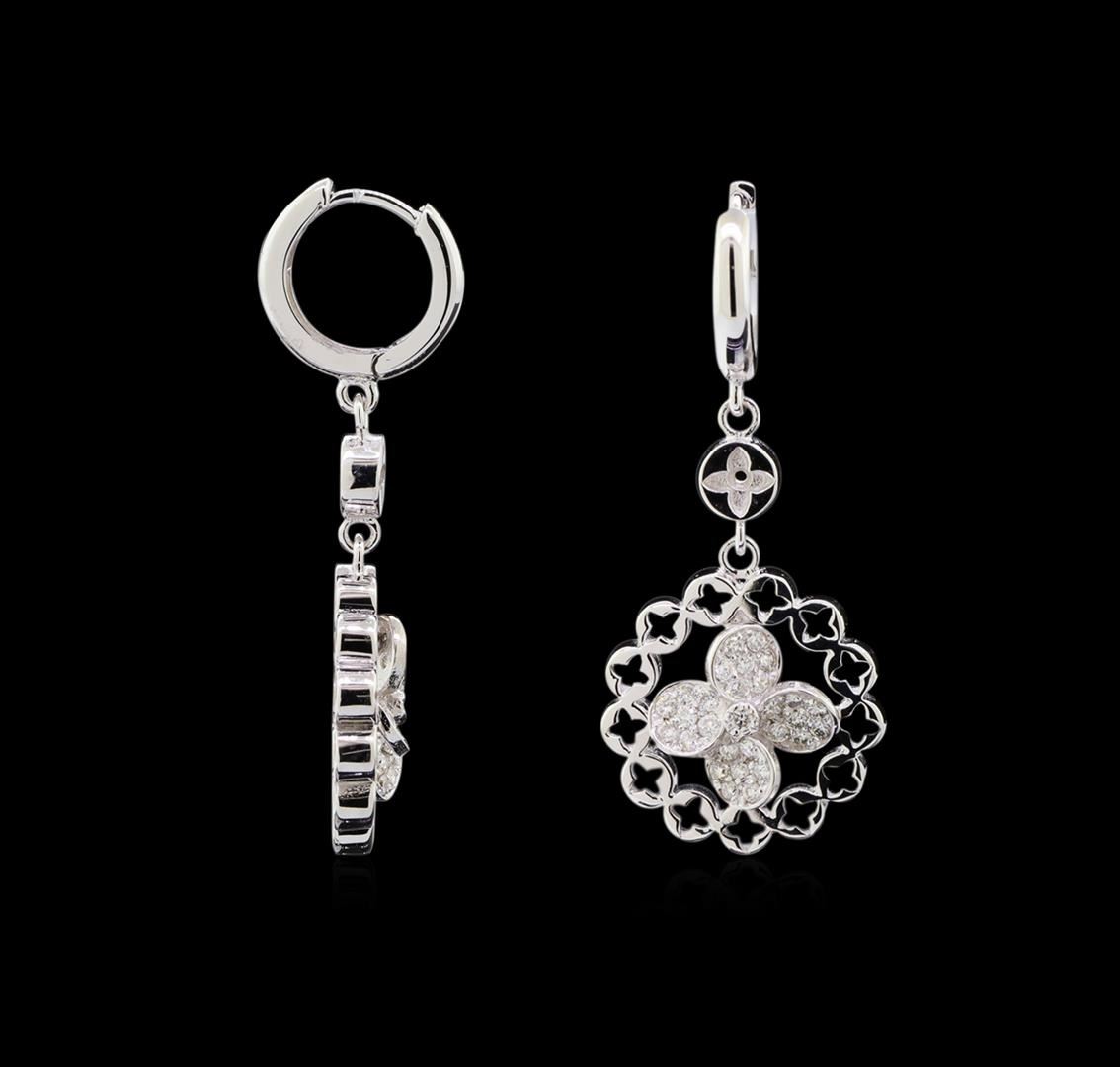 One pair electronically tested 14KT white gold lady's combination cast & assembled fashion dangle earrings with hinged, snap locking posts with a bright polish finish. Condition is new, good workmanship. The featured lady's dangle earrings have a 40 millimeter drop in length. Identified with markings of "14K". Containing: Fifty-six prong set brilliant cut diamonds, measuring 1.40 - 1.35 x 0.84 (depth est.) approximate total weight of 56 Stones = 0.56ct. Graded in setting. Clarity: SI-1 to SI-2. Color: G - H. Cut: Good. Two prong set round brilliant cut diamonds, measuring 1.80 - 1.70 x 1.07mm (depth est.) approximate total weight of 2 Stones = 0.04ct. Graded in setting. Clarity: VS-2 to SI-1. Color: G - H. Cut: Very Good. Total Weight of Diamonds: 0.60ct. Total Weight of Dangle Earrings: 7.30gm. GAS Appraised at $3,120.00.