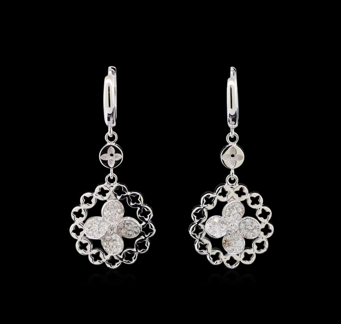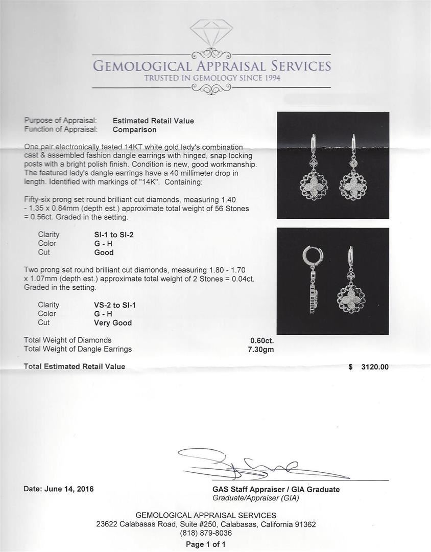 One pair electronically tested 14KT white gold lady's combination cast & assembled fashion dangle earrings with hinged, snap locking posts with a bright polish finish. Condition is new, good workmanship. The featured lady's dangle earrings have a 40 millimeter drop in length. Identified with markings of "14K". Containing: Fifty-six prong set brilliant cut diamonds, measuring 1.40 - 1.35 x 0.84 (depth est.) approximate total weight of 56 Stones = 0.56ct. Graded in setting. Clarity: SI-1 to SI-2. Color: G - H. Cut: Good. Two prong set round brilliant cut diamonds, measuring 1.80 - 1.70 x 1.07mm (depth est.) approximate total weight of 2 Stones = 0.04ct. Graded in setting. Clarity: VS-2 to SI-1. Color: G - H. Cut: Very Good. Total Weight of Diamonds: 0.60 ct. Total Weight of Dangle Earrings: 7.30gm. GAS Appraised.
