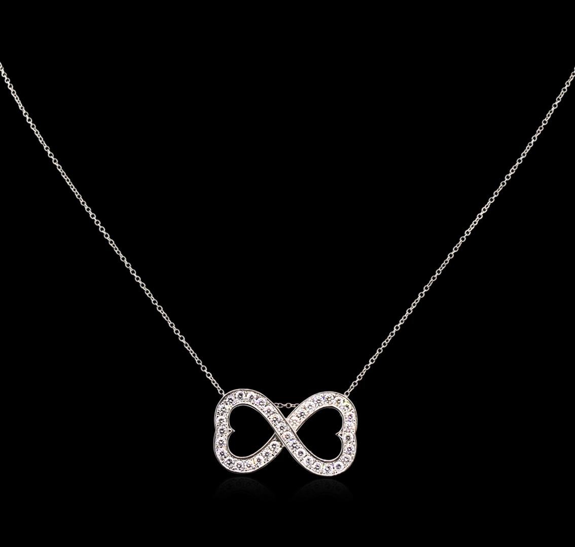 One infinity pendant with chain featuring: 14KT white gold weighing 6.16 grams containing diamonds with a total weight of 0.60ct.