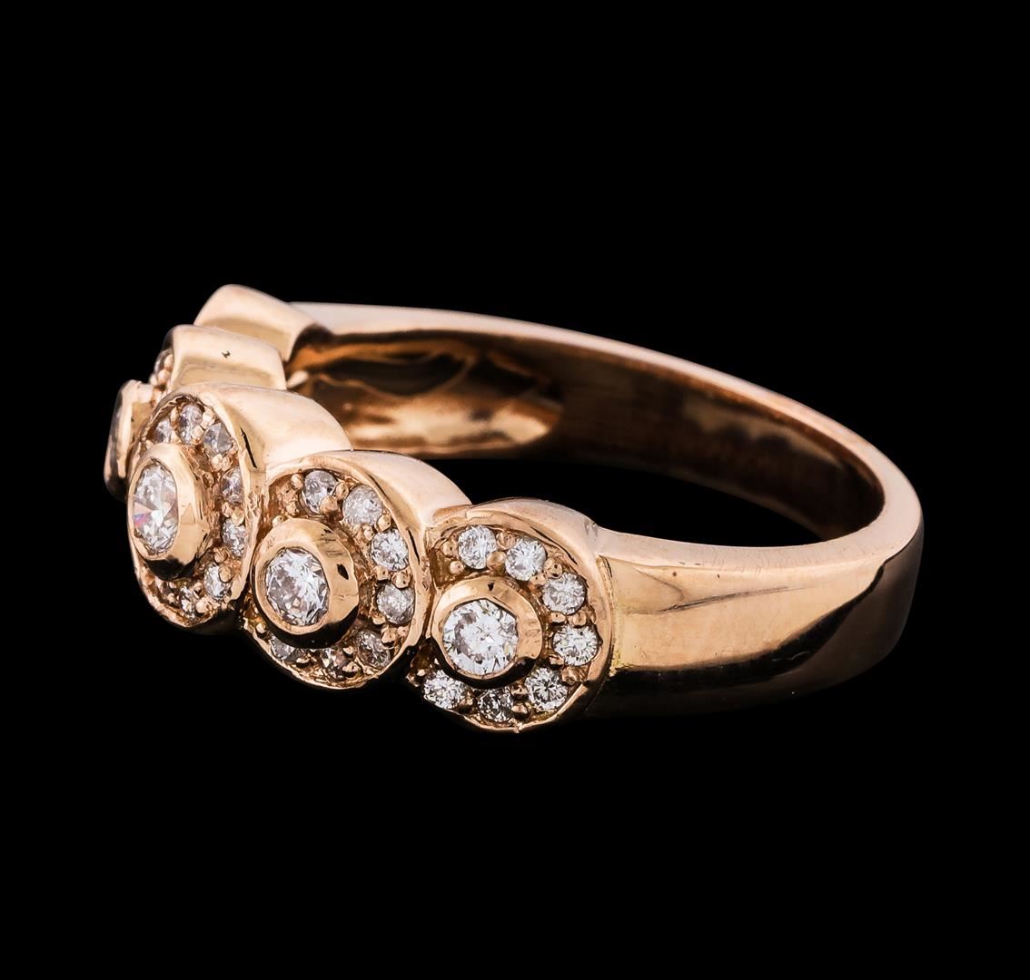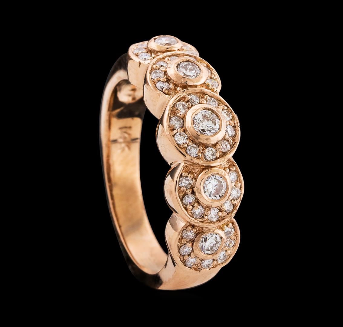 One Diamond Ring featuring: 14KT Rose Gold with a total weight of 5.85 grams, 38 Diamonds with a total weight of 0.28ctw, and 5 Diamonds with a total weight of 0.32ctw.
