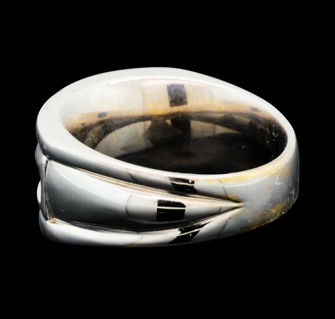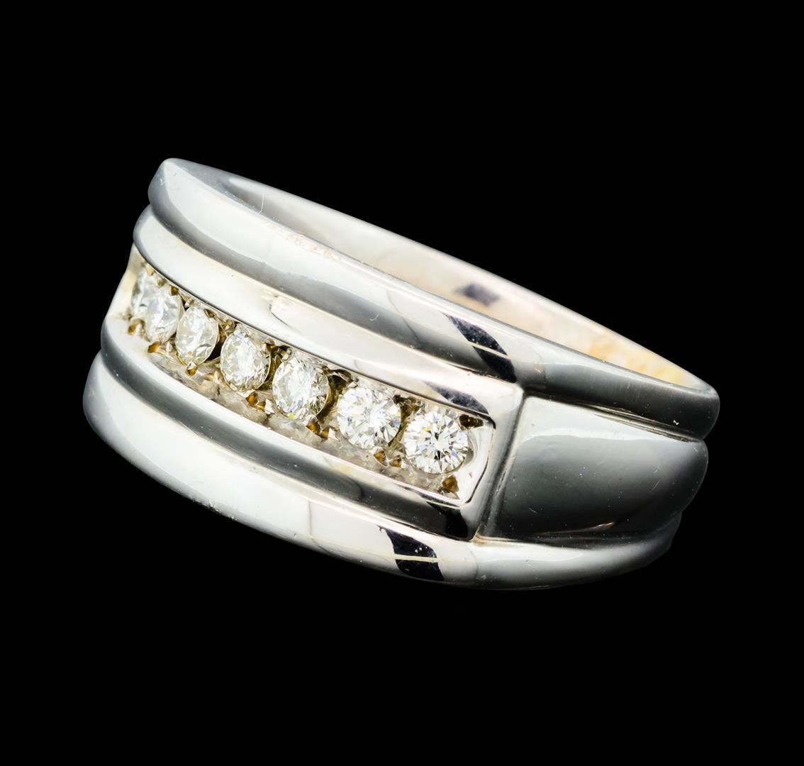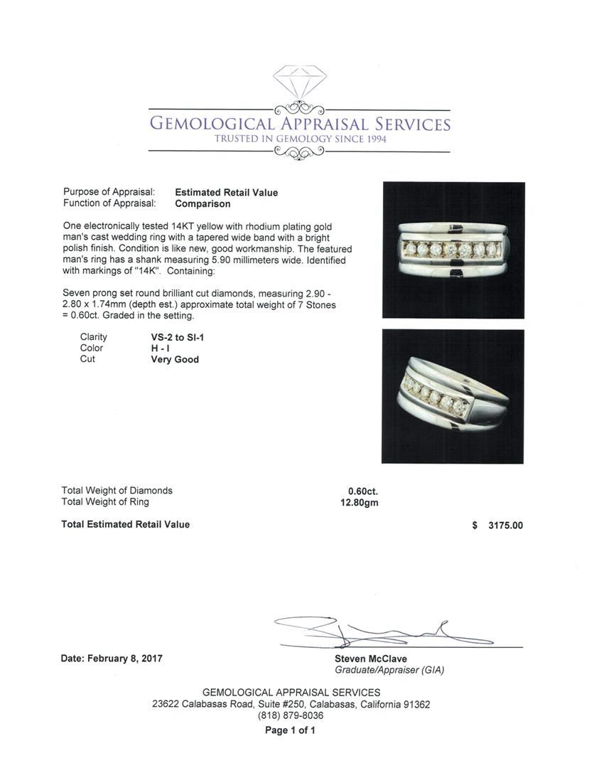 One electronically tested 14KT yellow with rhodium plating gold man's cast wedding ring with a tapered wide band with a bright polish finish. The featured man's ring has a shank measuring 5.90 millimeters wide. Identified with markings of '14K'. Condition is like new, good workmanship. Containing: Seven prong set round brilliant cut diamonds, measuring 2.90 - 2.80 x 1.74mm (depth est.) approximate total weight of 7 Stones = 0.60ct. Graded in the setting. Clarity VS-2 to SI-1. Color: H - I Cut Very Good. Total Weight of Diamonds 0.60ct.. Total Weight of Ring 12.80gm GAS Appraised at $3,175.00.