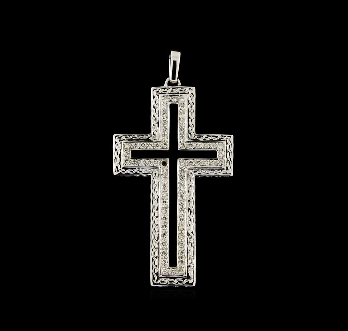 One electronically tested 18KT white gold cast & assembled onyx and diamond "cross" pendant. The pendant features a 36.0 x 18.0mm onyx cross set within an inner diamond bezel and an outer white gold patterned bezel, completed by a white gold bail. Bright polish finish. Area measurements 2.00 x 1.00 inch. Identified with markings of "K18". Condition is good. Containing: Sixty-Six prong set round brilliant cut diamonds, measuring 1.30 - 1.20 x 0.75mm (depth est.) approximate total weight of 66 Stones = 0.60ct. Graded in the setting. Clarity: SI-1 to SI-2. Color: G - I. Total Weight of Diamonds 0.60ct. Total Weight of Pendant 9.68gm. AIG Appraised at $4,305.00.
