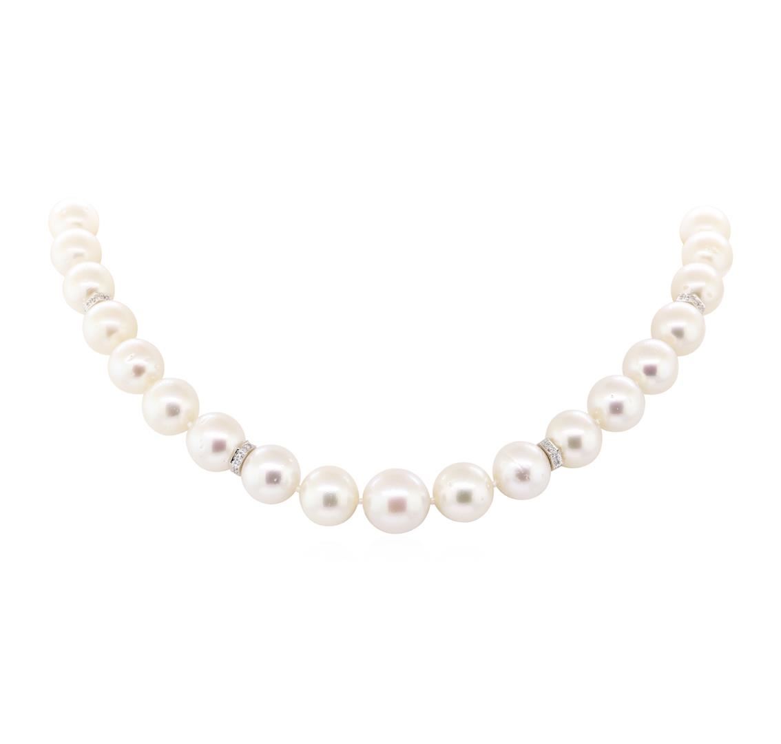 One graduated single strand pearl necklace 18.5' princess length, knotted with a tongue clasp & foldover safety containing 33 south sea cultured pearls, 14.8mm to 11.9mm in size. The pearls are white in color with a good luster, round to near round, and moderately blemished with very good matching. The featured pearl necklace has six white gold rondels and is terminated in a white gold clasp. Graded on the strand.South Sea cultured pearls are farmed in the oceans surrounding Australia, Indonesia, the Philippines and the southern coast of China. The main source of Australian South Sea pearls lies in the northwest on the Kimberly coast. South Sea cultured pearls are formed in the Pinctada Maxima oyster. These pearls take between two to three years to grow and have a unique nacre due to the fast moving and clean waters of the South Seas. One Hundred prong set single cut diamonds, measuring 1.20 - 1.10 x 0.71mm (depth est.) approximate total weight of 100 Stones = 0.60 ct. Graded in the setting. Color H - I Clarity VS-2 to SI-1 Cut Very Good. Total Weight of Diamonds 0.60 ct.. Total Weight of 104.20gm GAS Appraised at $40305.00. GAS Appraised.