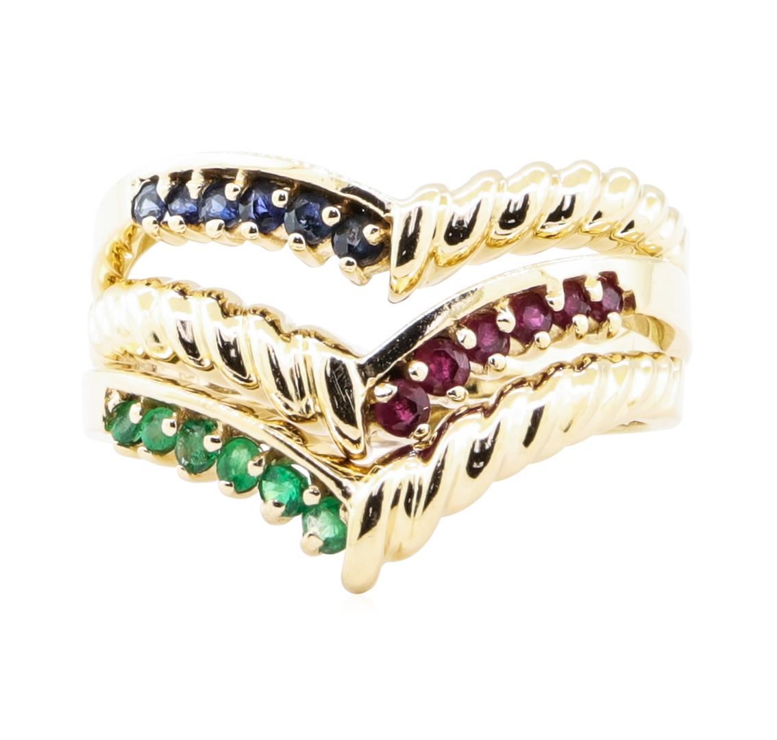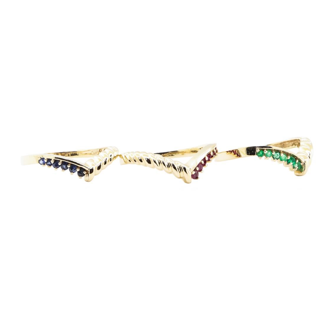 One stackable set of three rings featuring: 14KT yellow gold weighing 6.4 grams containing emeralds weighing 0.20 ctw, sapphires weighing 0.20 ctw, and rubies weighing 0.20 ctw.