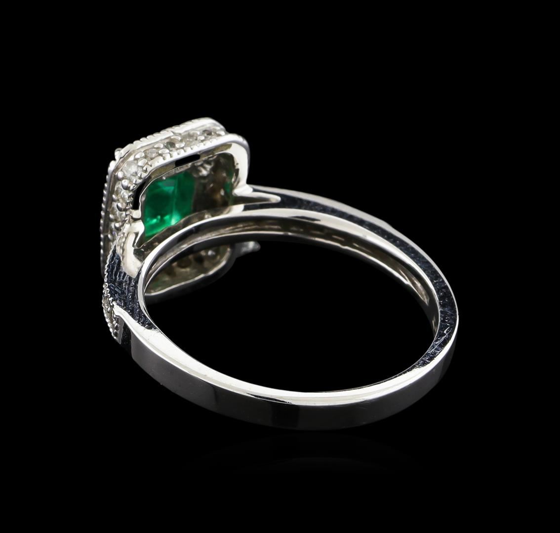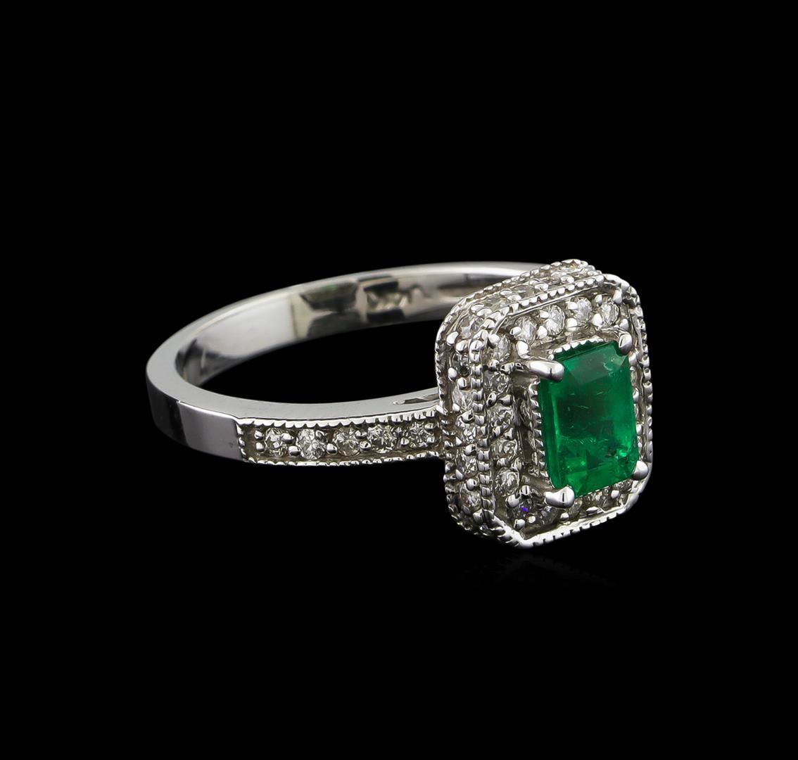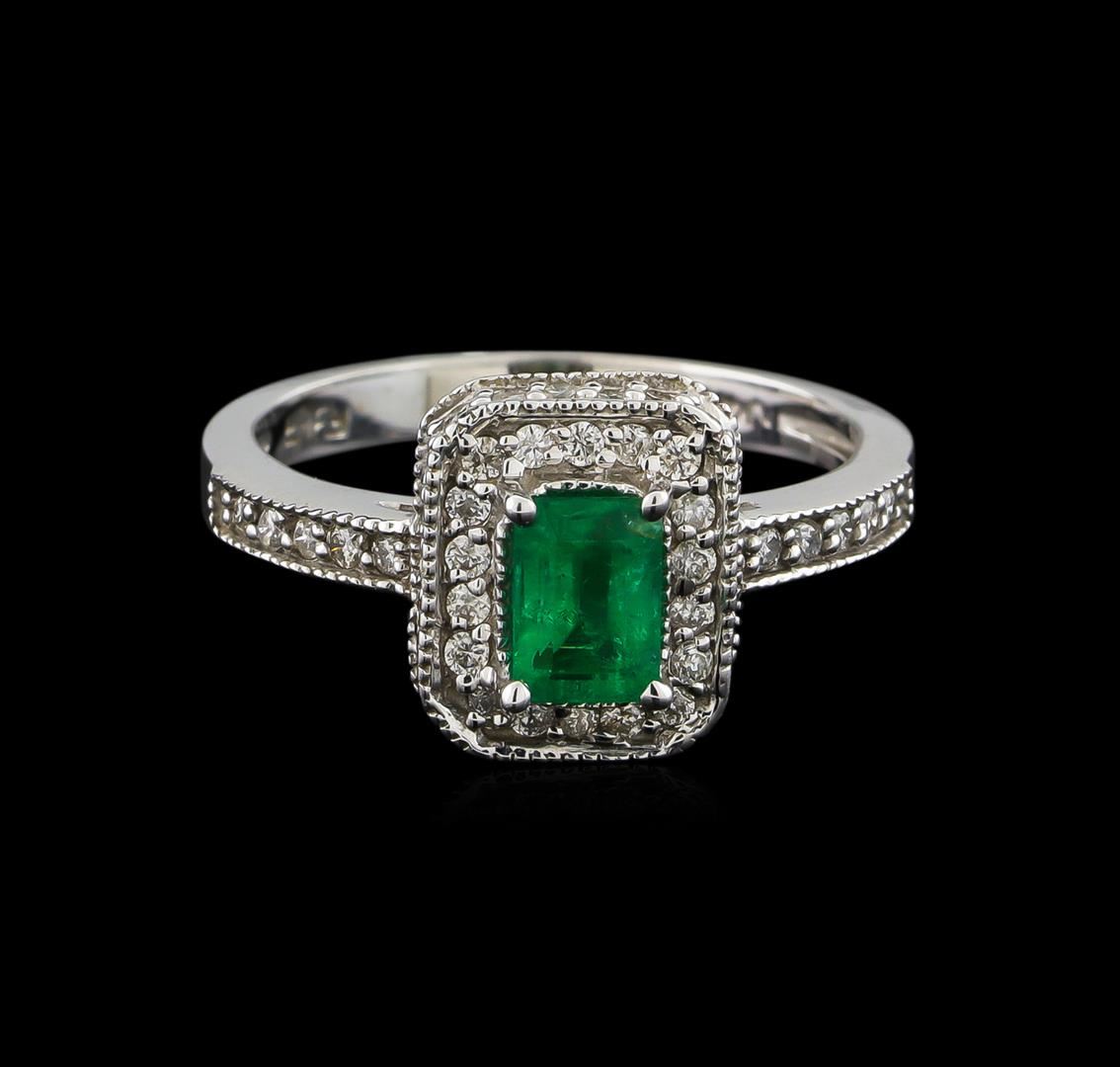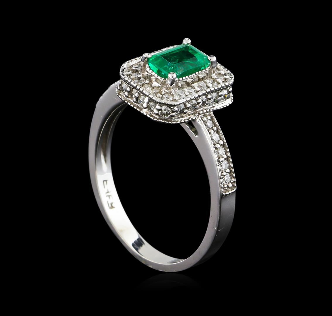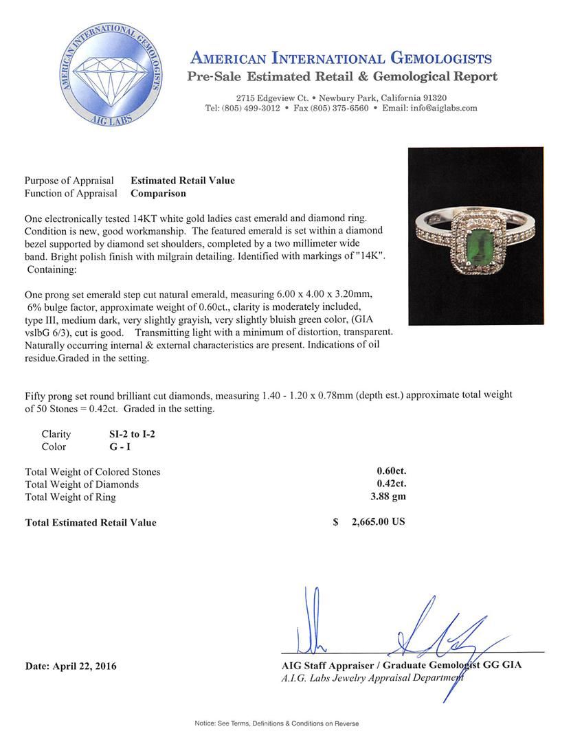 One electronically tested 14KT white gold ladies cast emerald and diamond ring. The featured emerald is set within a diamond bezel supported by diamond set shoulders, completed by a two millimeter wide band. Bright polish finish with milgrain detailing. Identified with markings of "14K". Condition is new, good workmanship. Containing: One prong set emerald step cut natural emerald, measuring 6.00 x 4.00 x 3.20mm, 6%. bulge factor, approximate weight of 0.60ct., clarity is moderately included, type III, medium dark, very slightly grayish, very slightly bluish green color, (GIA vslbG 6/3), cut is good. Transmitting light with a minimum of distortion, transparent. Naturally occurring internal & external characteristics are present. Indications of oil residue. Graded in the setting. Fifty prong set round brilliant cut diamonds, measuring 1.40 - 1.20 x 0.78mm (depth est.) approximate total weight of 50 Stones = 0.42ct. Graded in the setting. Clarity: SI-2 to I-2. Color: G - I. Total Weight of Colored Stones 0.60ct. Total Weight of Diamonds 0.42ct. Total Weight of Ring 3.88gm. AIG Appraised at $2,665.00.