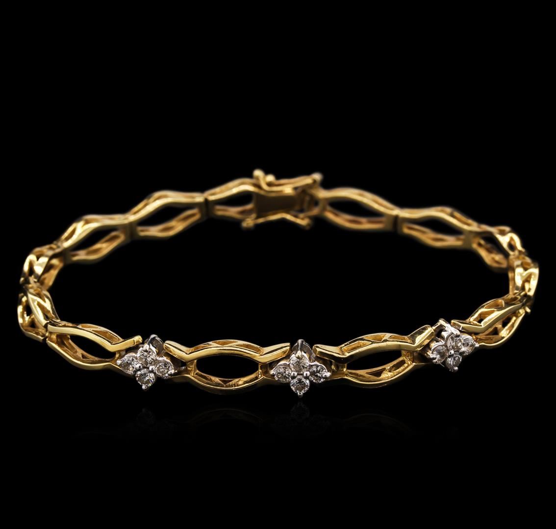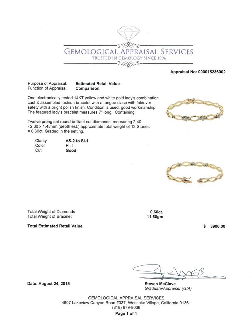 One electronically tested 14KT yellow and white gold lady's combination cast & assembled fashion bracelet with a tongue clasp with foldover safety with a bright polish finish. The featured lady's bracelet measures 7" long. Condition is used, good workmanship. Containing: Twelve prong set round brilliant cut diamonds, measuring 2.40 - 2.30 x 1.48mm (depth est.) approximate. Total Weight of 12 Stones = 0.60ct. Graded in the setting. Clarity: VS-2 to SI-1. Color: H - I. Cut Good. Total Weight of Diamonds 0.60ct. Total Weight of Bracelet 11.60gm. GAS Appraised at $3,900.00.
