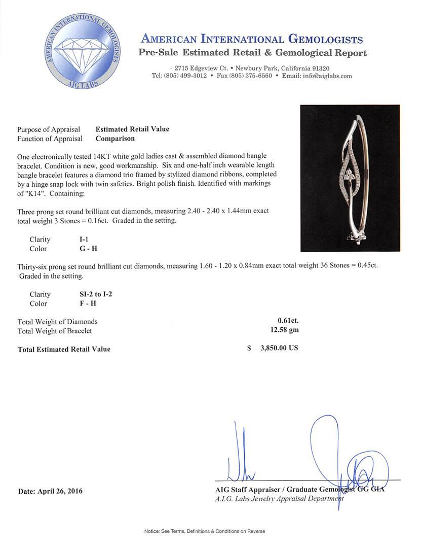 One electronically tested 14KT white gold ladies cast & assembled diamond bangle bracelet. Six and one-half inch wearable length bangle bracelet features a diamond trio framed by stylized diamond ribbons, completed by a hinge snap lock with twin safeties. Bright polish finish. Identified with markings of "K14". Condition is new, good workmanship. Containing: Three prong set round brilliant cut diamonds, measuring 2.40 - 2.40 x 1.44mm exact total weight 3 Stones = 0.16ct. Graded in the setting. Clarity: I-1. Color: G - H Thirty-Six prong set round brilliant cut diamonds, measuring 1.60 - 1.20 x 0.84mm exact total weight 36 Stones = 0.45ct. Graded in the setting. Clarity: SI-2 to I-2. Color: F - H. Total Weight of Diamonds 0.61ct. Total Weight of Bracelet 12.58gm. AIG Appraised at $3,850.00.
