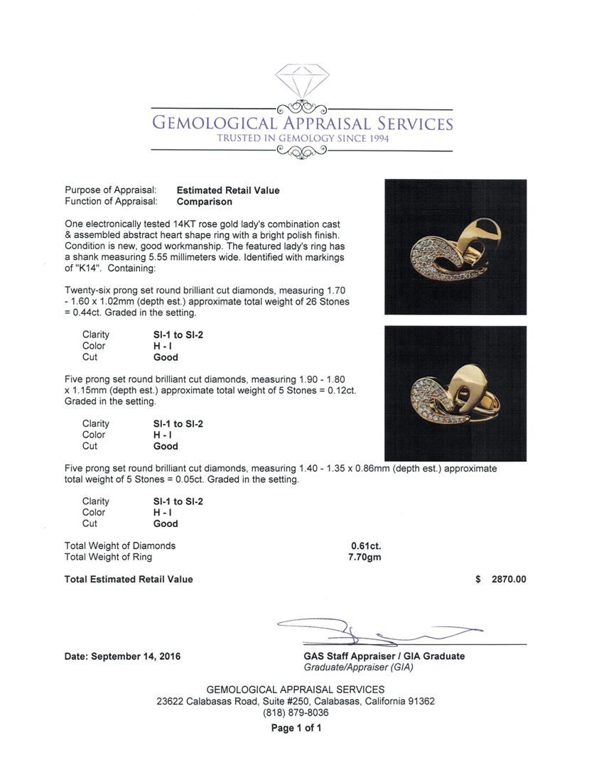 One electronically tested 14KT rose gold lady's combination cast & assembled abstract heart shape ring with a bright polish finish. The featured lady's ring has a shank measuring 5.55 millimeters wide. Identified with markings of 'K14'. Condition is new, good workmanship. Containing: Twenty-Six prong set round brilliant cut diamonds, measuring 1.70 - 1.60 x 1.02mm (depth est.) approximate total weight of 26 Stones = 0.44ct. Graded in the setting. Clarity SI-1 to SI-2. Color: H - I Cut Good Five prong set round brilliant cut diamonds, measuring 1.90 - 1.80 x 1.15mm (depth est.) approximate total weight of 5 Stones = 0.12ct. Graded in the setting. Clarity SI-1 to SI-2. Color: H - I Cut Good Five prong set round brilliant cut diamonds, measuring 1.40 - 1.35 x 0.86mm (depth est.) approximate total weight of 5 Stones = 0.05ct. Graded in the setting. Clarity SI-1 to SI-2. Color: H - I Cut Good. Total Weight of Diamonds 0.61ct.. Total Weight of Ring 7.70gm GAS Appraised.