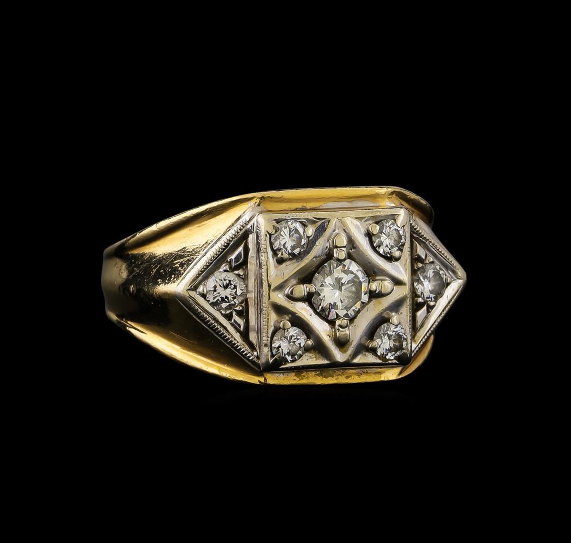 One electronically tested 14KT yellow and white gold man's combination cast & assembled wedding ring with a bright polish with milgrain detailing finish. The featured lady's ring has a shank measuring 4.4 millimeters wide. Identified with markings of "14K". Condition is used. Containing: One prong set round brilliant cut diamond, measuring 3.90 - 3.85 x 2.33mm (depth est.) approximate weight of 0.22ct. Graded in the setting. Clarity: SI-1. Color: I. Cut Good Two prong set round brilliant cut diamonds, measuring 2.82 - 2.80 x 1.74mm (depth est.) approximate total weight of 2 Stones = 0.17ct. Graded in the setting. Clarity: VS-1 to VS-2. Color: I - Good Four prong set round brilliant cut diamonds, measuring 2.45 - 2.40 x 1.51mm (depth est.) approximate total weight of 4 Stones = 0.22ct. Graded in the setting. Clarity: VS-2 to SI-1. Color: I - Good. Total Weight of Diamonds 0.61ct. Total Weight of Ring 7.40gm. GAS Appraised at $2,815.00.