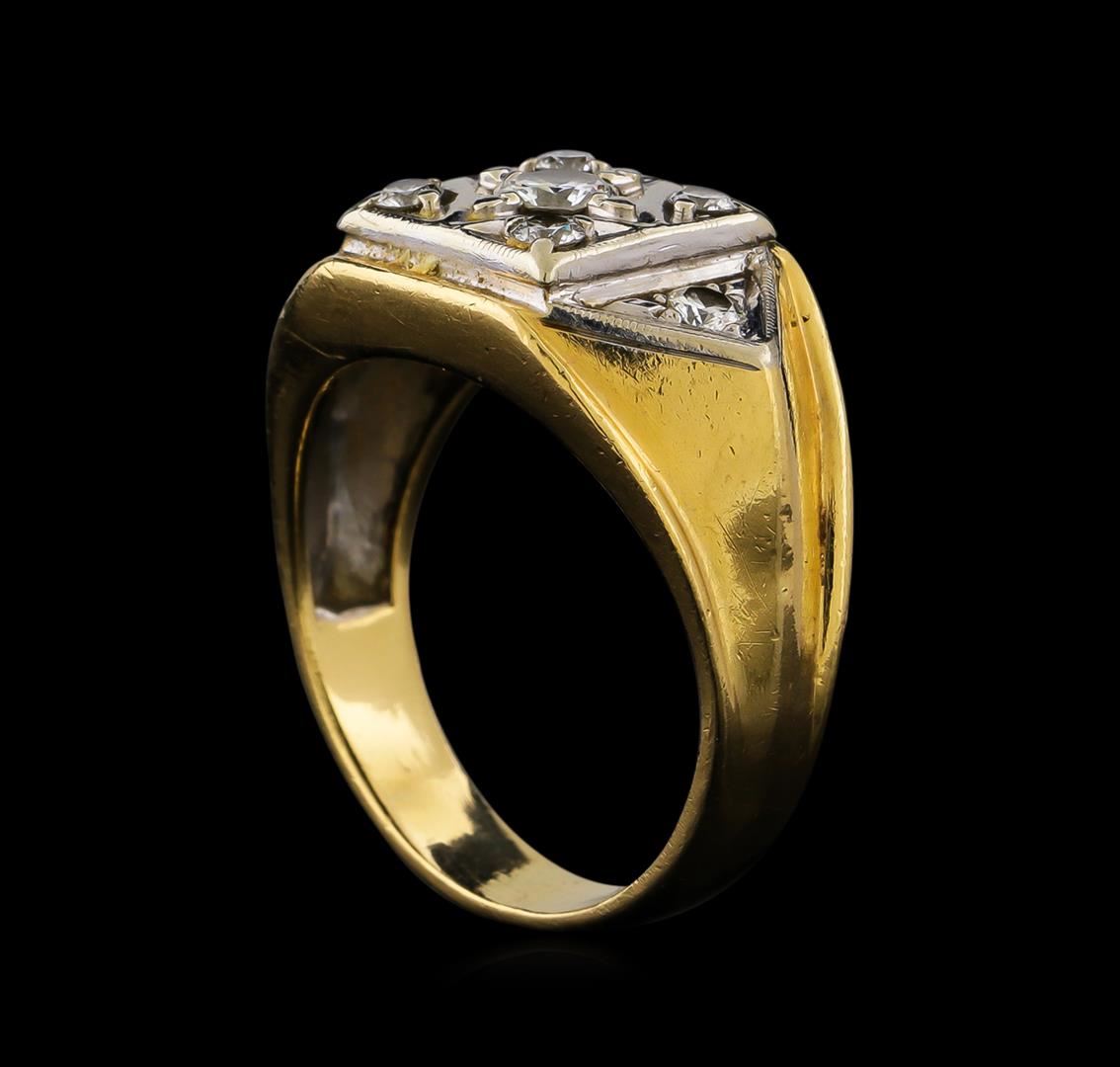 One electronically tested 14KT yellow and white gold man's combination cast & assembled wedding ring with a bright polish with milgrain detailing finish. The featured lady's ring has a shank measuring 4.4 millimeters wide. Identified with markings of "14K". Condition is used. Containing: One prong set round brilliant cut diamond, measuring 3.90 - 3.85 x 2.33mm (depth est.) approximate weight of 0.22ct. Graded in the setting. Clarity: SI-1. Color: I. Cut Good Two prong set round brilliant cut diamonds, measuring 2.82 - 2.80 x 1.74mm (depth est.) approximate total weight of 2 Stones = 0.17ct. Graded in the setting. Clarity: VS-1 to VS-2. Color: I - Good Four prong set round brilliant cut diamonds, measuring 2.45 - 2.40 x 1.51mm (depth est.) approximate total weight of 4 Stones = 0.22ct. Graded in the setting. Clarity: VS-2 to SI-1. Color: I - Good. Total Weight of Diamonds 0.61ct. Total Weight of Ring 7.40gm. GAS Appraised at $2,815.00.