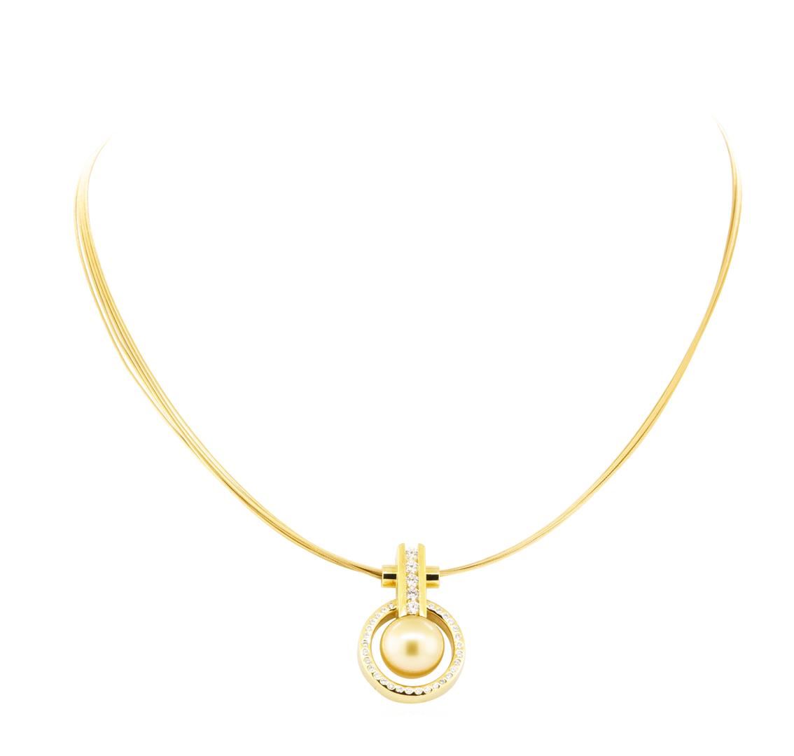 One electronically tested 18KT yellow gold lady's combination cast & assembled fashion pendant and chain 18.0' long, multi-strand cable chain with a spring loaded plunger clasp with a bright polish finish. Trademark is TDL. Identified with markings of '18K'. Condition is like new, good workmanship. Containing: One south sea cultured pearl, 12.0mm to 11.9mm in size. The pearl is golden in color with a very good luster, round, and clean. Graded in the setting. Five channel set round brilliant cut diamonds, measuring 2.70 - 2.65 x 1.66mm (depth est.) approximate total weight of 5 Stones = 0.36ct. Graded in the setting. Color F - G Clarity VS-1 to VS-2 Cut Excellent Thirty bezel set round brilliant cut diamonds, measuring 1.30 - 1.30 x 0.81mm (depth est.) approximate total weight of 30 Stones = 0.25ct. Graded in the setting. Color F - G Clarity VS-1 to VS-2 Cut Excellent. Total Weight of Diamonds 0.61ct.. Total Weight of Pendant And Chain 24.20gm GAS Appraised at $8180.00. GAS Appraised.