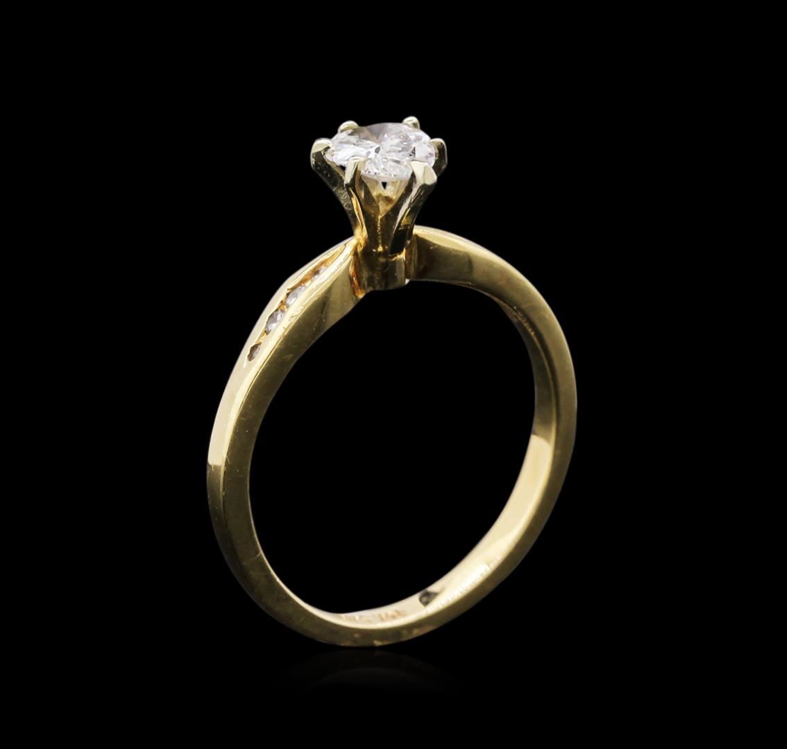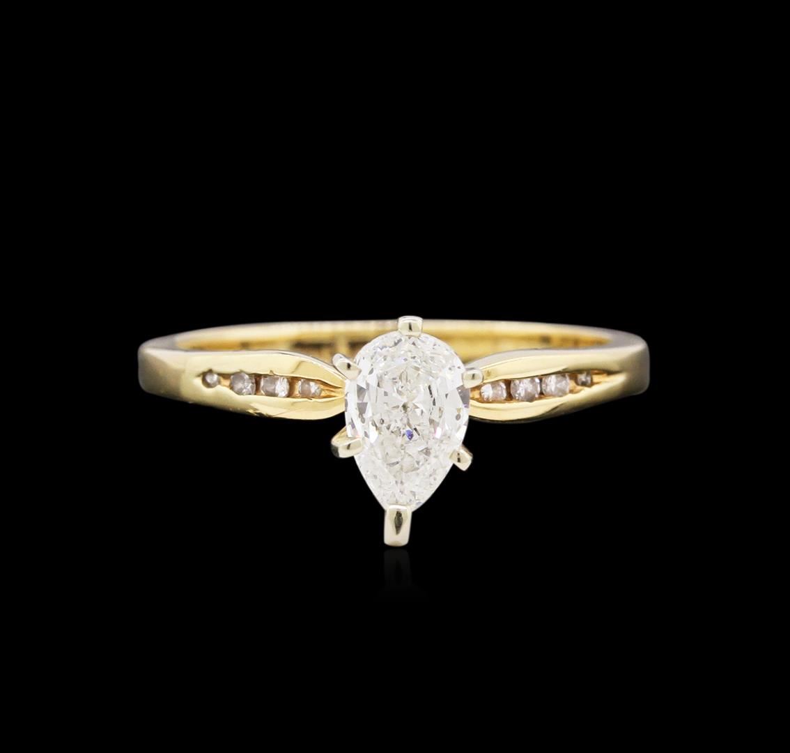 One electronically tested 14KT yellow gold lady's cast wedding ring with a bright polish finish. The featured lady's ring has a shank measuring 1.88 millimeters wide. Identified with markings of "14K". Condition is new, good workmanship. Containing: One prong set pear shaped cut diamond, measuring 7.10 x 4.62 x 2.91mm (depth est.) approximate weight of 0.56ct. Graded in the setting. Clarity: SI-2. Color: Good Eight channel set round brilliant cut diamonds, measuring 1.30 - 1.00 x 0.75mm (depth est.) approximate total weight of 8 Stones = 0.05ct. Graded in the setting. Clarity: SI-1 to SI-2. Color: H - I. Cut Good. Total Weight of Diamonds 0.61ct. Total Weight of Ring 2.50gm. GAS Appraised at $3,410.00.