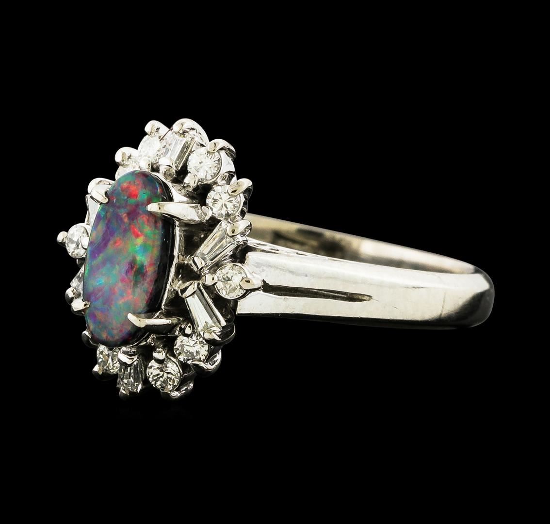 One ring featuring: Platinum containing Black Opal with a total weight of 0.62ct and Diamonds with a total weight of 0.29ct. Total Weight of Ring: 5 grams.