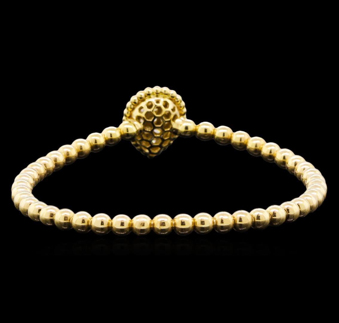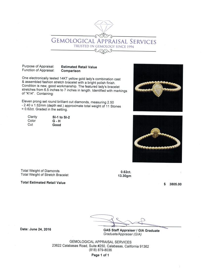 One electronically tested 14KT yellow gold lady's combination cast & assembled fashion stretch bracelet with a bright polish finish. The featured lady's bracelet stretches from 6.5 inches to 7 inches in length. Identified with markings of "K14". Condition is new, good workmanship. Containing: Eleven prong set round brilliant cut diamonds, measuring 2.50 - 2.40 x 1.52mm (depth est.) approximate total weight of 11 Stones = 0.62ct. Graded in the setting. Clarity: SI-1 to SI-2. Color: G - H. Cut Good. Total Weight of Diamonds 0.62ct. Total Weight of Stretch Bracelet 13.30gm. GAS Appraised at $3,805.00.
