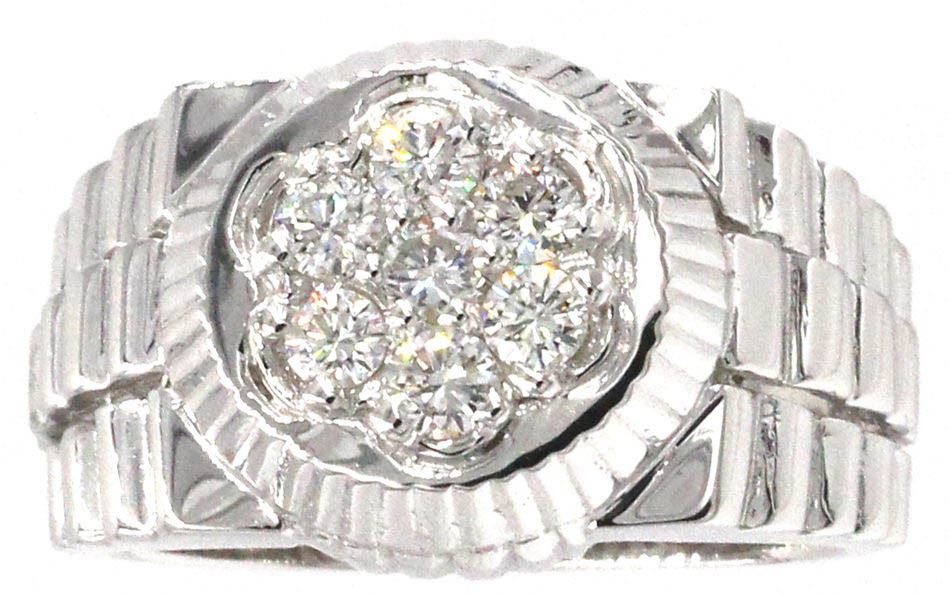 One men's ring featuring: 14KT white gold weighing 8.30 grams containing 7 diamonds weighing 0.62ctw. The diamonds are round brilliant cut with SI1 clarity, G-H color and excellent cut. The ring is a size 8.75 but can be resized.