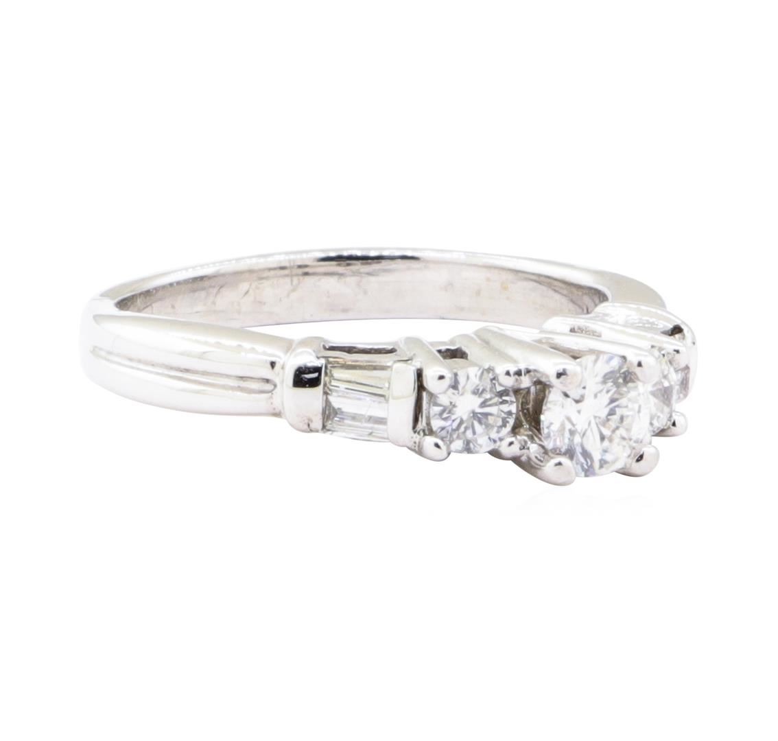 One electronically tested 14KT white gold lady's cast three stone wedding ring with a cathedral shank with a bright polish finish. The featured lady's ring has a shank measuring 2.50 millimeters wide. Identified with markings of '14K'. Condition is Good.