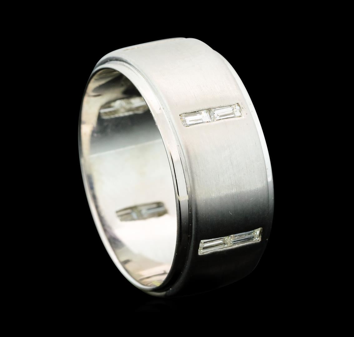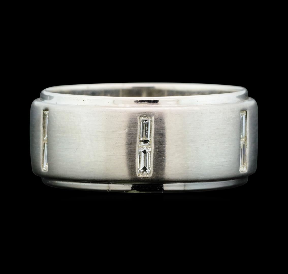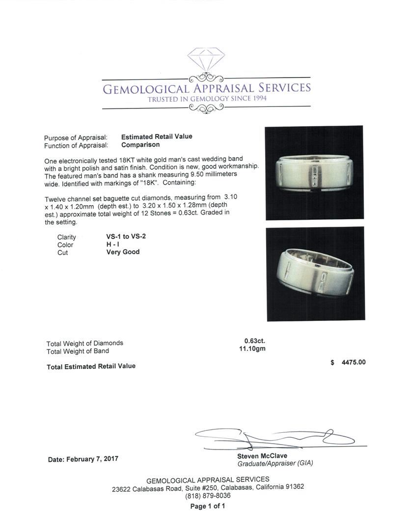 One electronically tested 18KT white gold man's cast wedding band with a bright polish and satin finish. The featured man's band has a shank measuring 9.50 millimeters wide. Identified with markings of '18K'. Condition is new, good workmanship. Containing: Twelve channel set baguette cut diamonds, measuring from 3.10 x 1.40 x 1.20mm (depth est.) to 3.20 x 1.50 x 1.28mm (depth est.) approximate total weight of 12 Stones = 0.63ct. Graded in the setting. Clarity VS-1 to VS-2. Color: H - I Cut Very Good. Total Weight of Diamonds 0.63ct.. Total Weight of Band 11.10gm GAS Appraised at $4,475.00.
