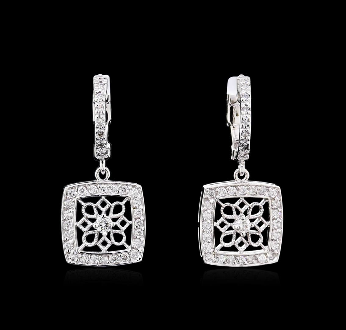 One pair of earrings featuring: 14KT white gold weighing 5.52 grams containing diamonds with a total weight of 0.63ct.
