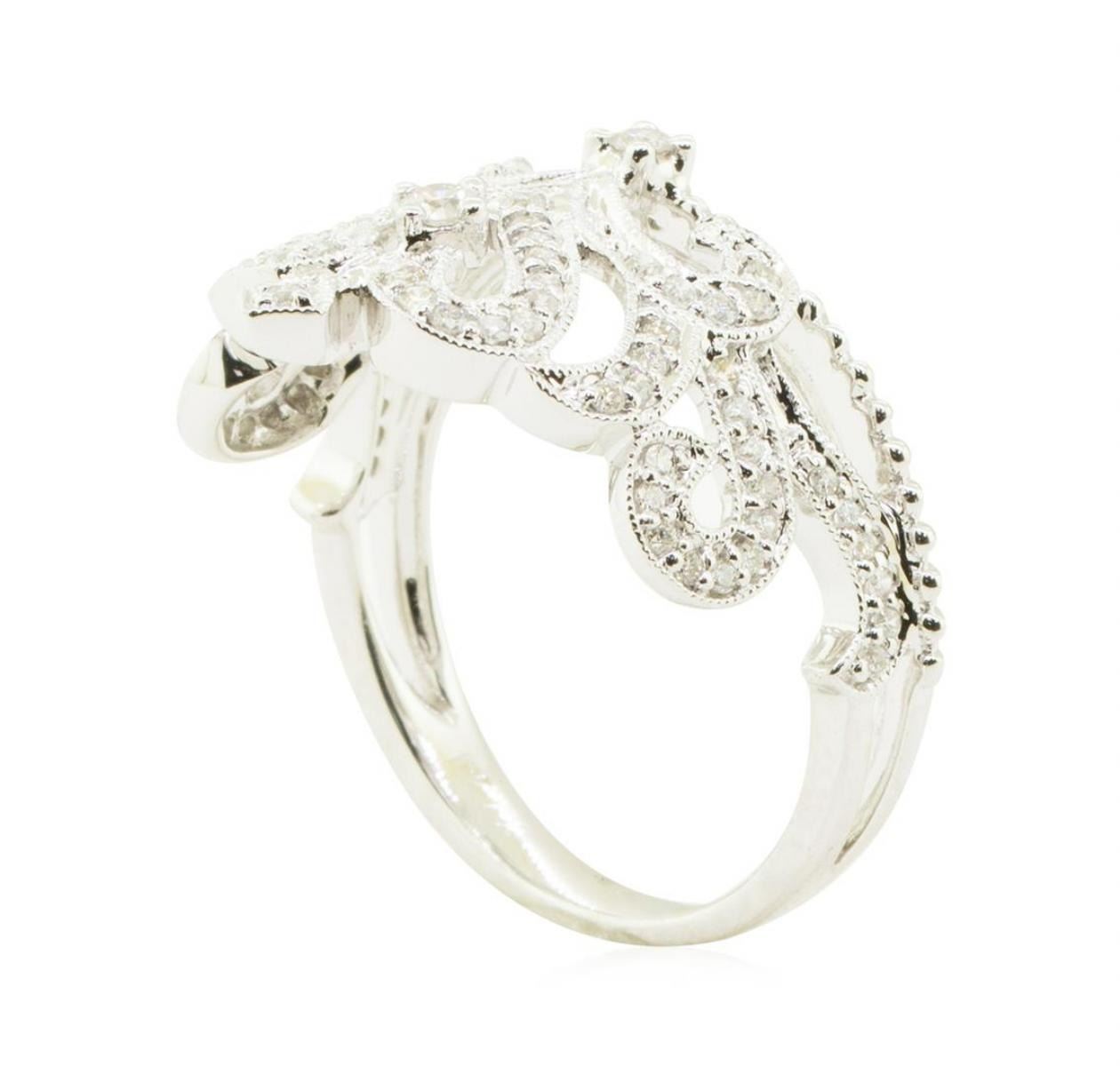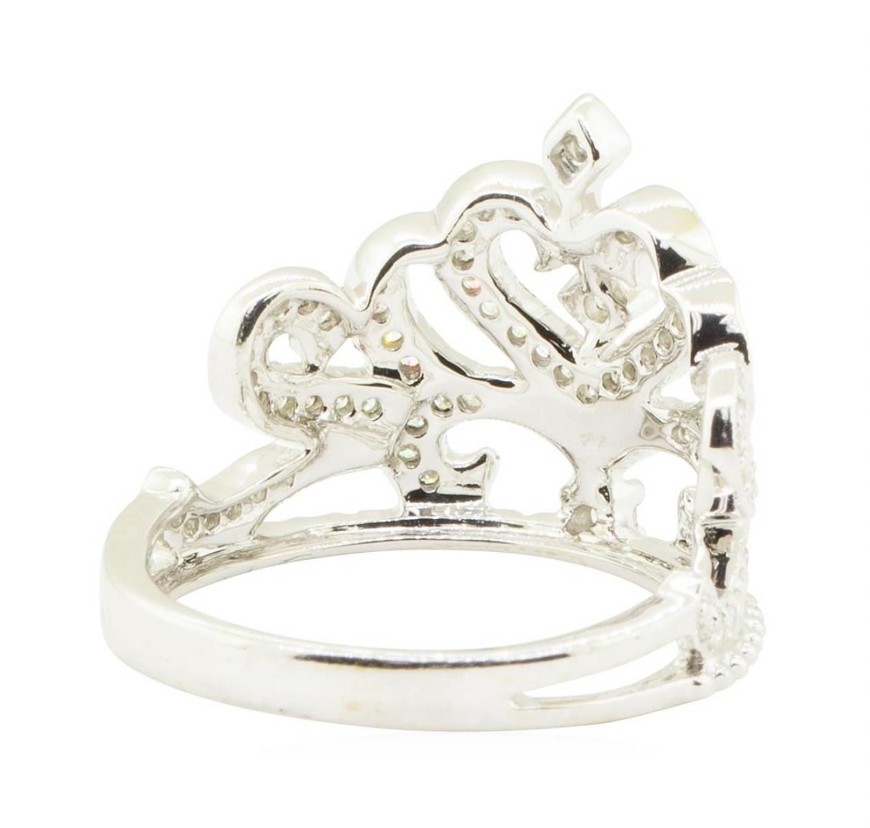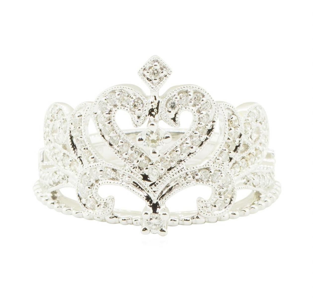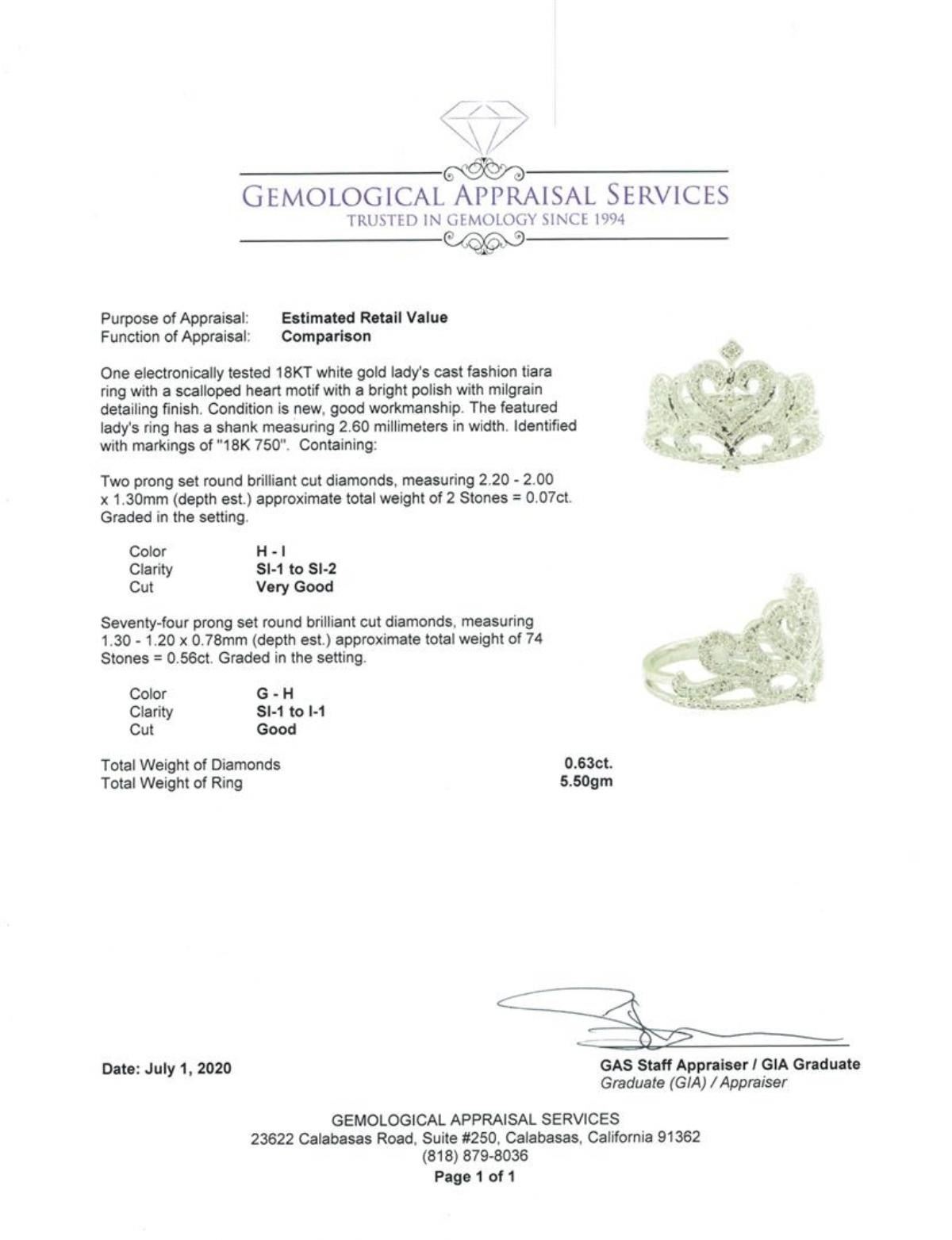 One electronically tested 18KT white gold lady's cast fashion tiara ring with a scalloped heart motif with a bright polish with milgrain detailing finish. The featured lady's ring has a shank measuring 2.60 millimeters in width. Identified with markings of '18K 750'. Condition is new, good workmanship. Containing: Two prong set round brilliant cut diamonds, measuring 2.20 - 2.00 x 1.30mm (depth est.) approximate total weight of 2 Stones = 0.07ct. Graded in the setting. Color H - I Clarity SI-1 to SI-2 Cut Very Good Seventy-Four prong set round brilliant cut diamonds, measuring 1.30 - 1.20 x 0.78mm (depth est.) approximate total weight of 74 Stones = 0.56ct. Graded in the setting. Color G - H Clarity SI-1 to I-1 Cut Good. Total Weight of Diamonds 0.63ct.. Total Weight of Ring 5.50gm GAS Appraised at $2830.00. GAS Appraised.