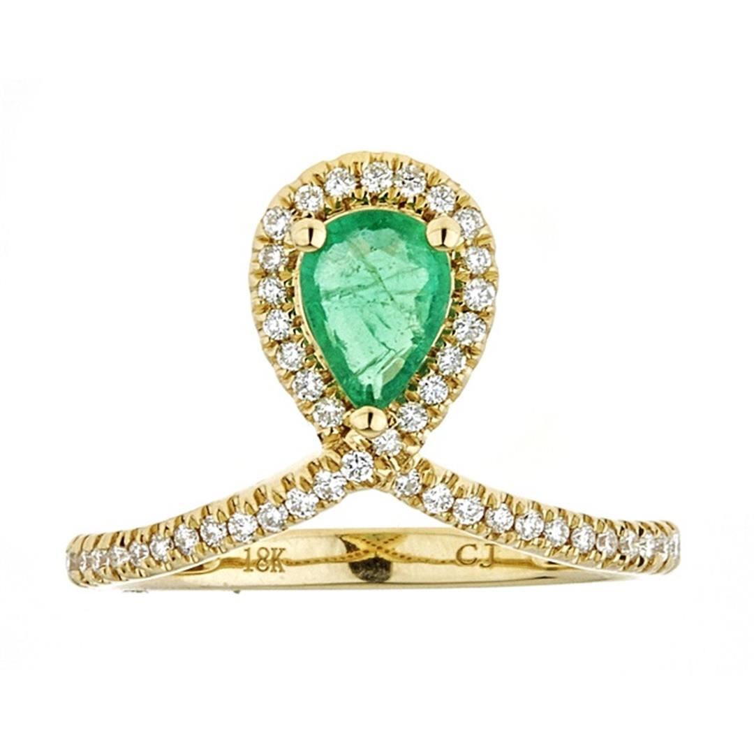 One Emerald and Diamond Ring featuring: 18KT Yellow Gold weighing a total of 3.80 grams, Emerald with a total weight of 0.63ct, and 45 Diamonds with a total weight of 0.23ctw.