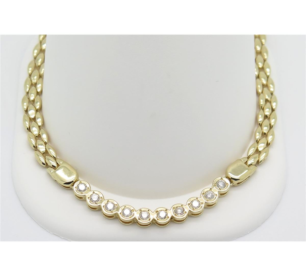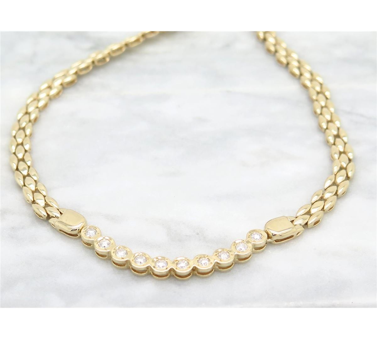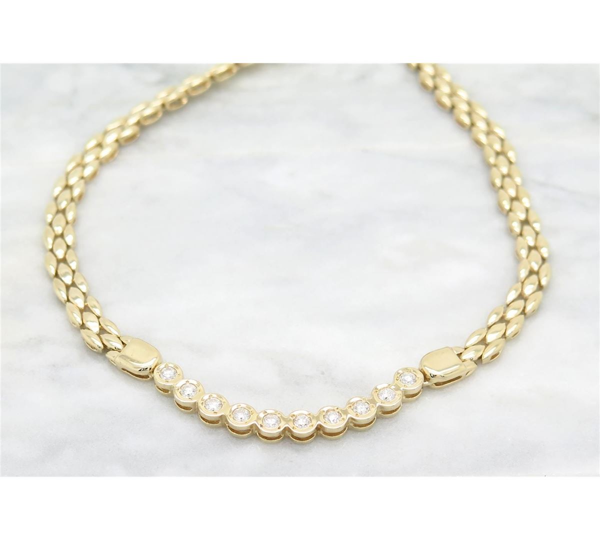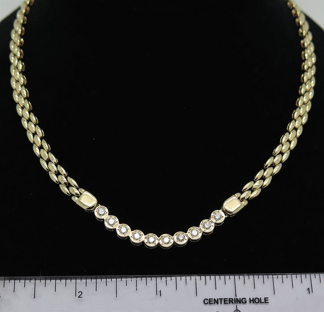 One tested 14K yellow gold diamond necklace. Condition is new. Containing: Ten Round Brilliant cut diamonds. Clarity: SI-I, Color: G-I. Approximate total diamond weight: .63CTW. Diamonds are graded in the mounting, unless otherwise stated. Weight of necklace: 30.6 grams. Length: 17 inches