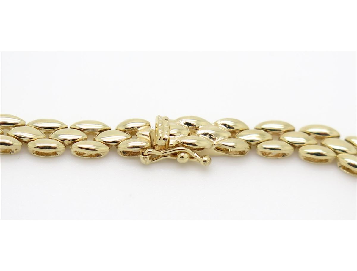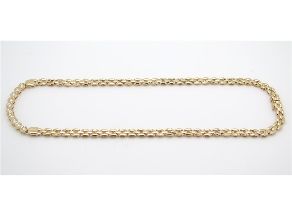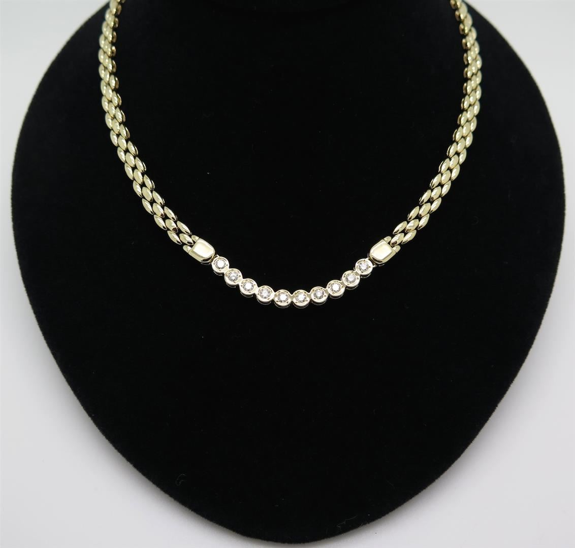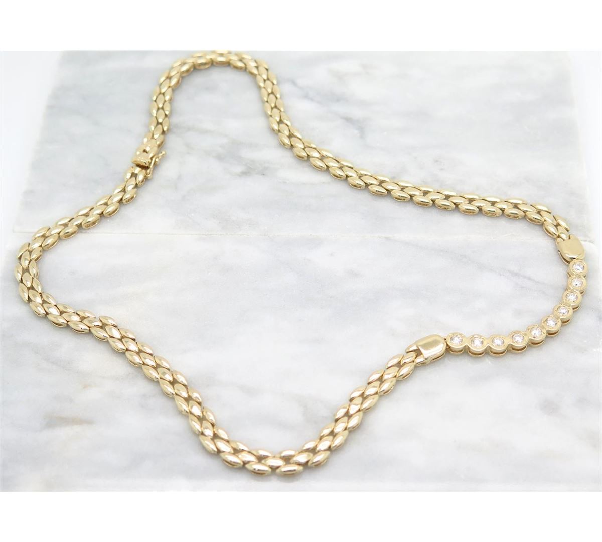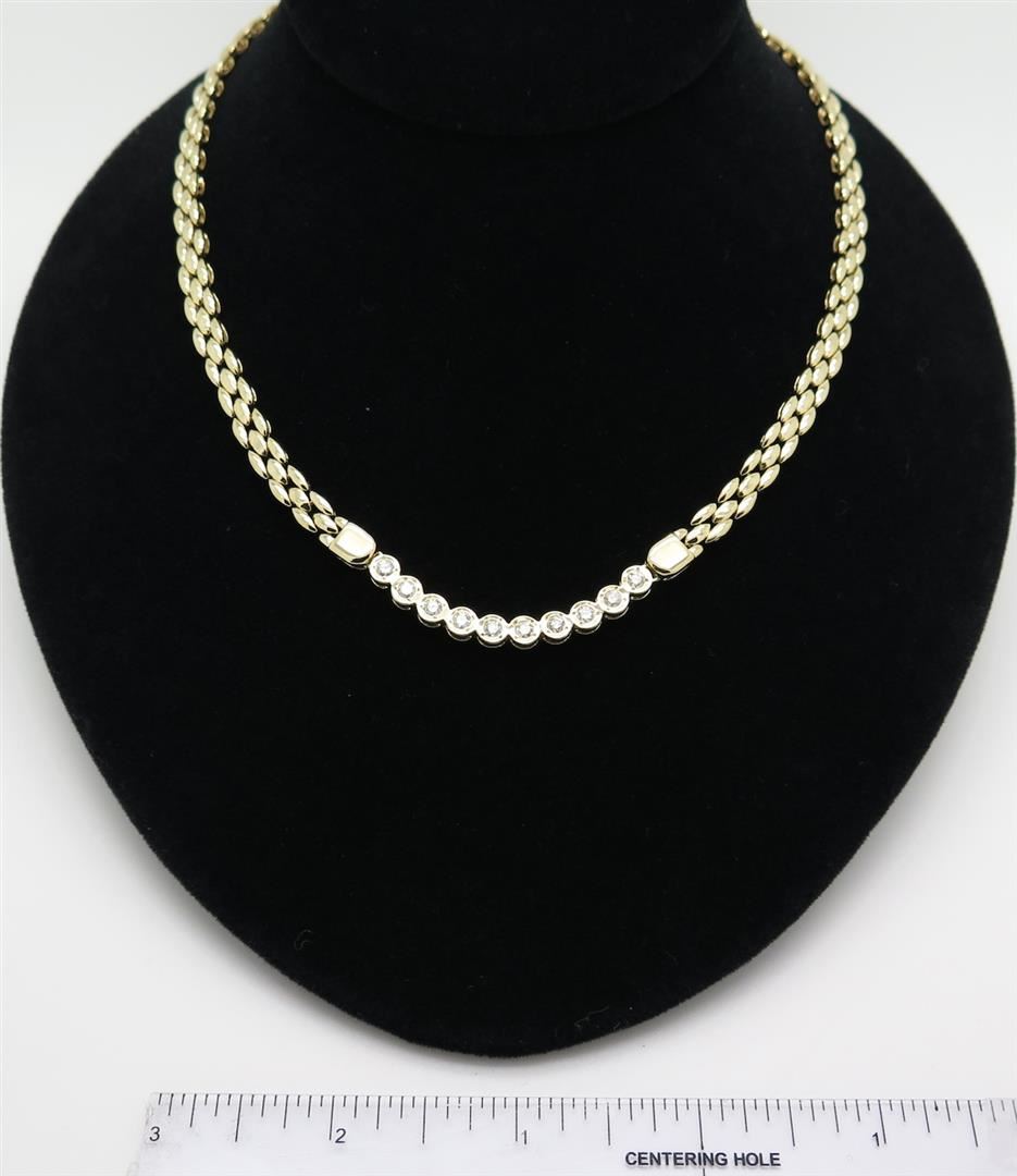 One tested 14K yellow gold diamond necklace. Condition is new. Containing: Ten Round Brilliant cut diamonds. Clarity: SI-I, Color: G-I. Approximate total diamond weight: .63CTW. Diamonds are graded in the mounting, unless otherwise stated. Weight of necklace: 30.6 grams. Length: 17 inches