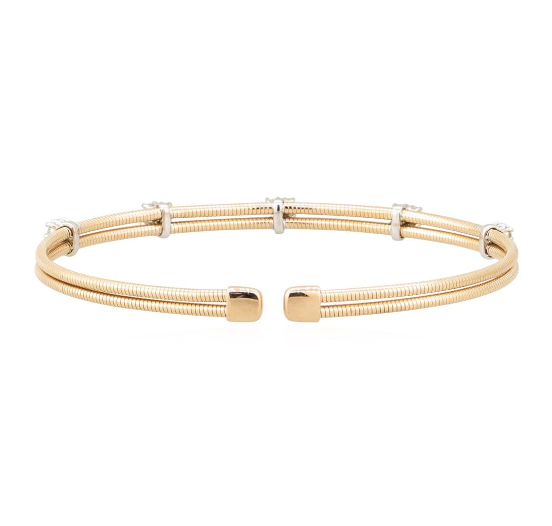One electronically tested 14KT rose gold ladies cast & assembled diamond cuff bracelet. The flexible cuff style bracelet features a series of five diamond cluster stations. Measures six and one half inches wearable length. Bright polish finish with white gold accents. Identified with markings of "14K". Condition is new, good workmanship. Containing: Twenty prong set round brilliant cut diamonds approximate total weight of 20 Stones = 0.64ct. The clarity & color grade reflect the overall average for the group. Graded in the setting. Clarity SI-2 to I-2 Color F - H Total Weight of Diamonds 0.64 ct. Total Weight of Cuff Bracelet 7.50 gm Estimated Retail Value $ 3,125.00 US